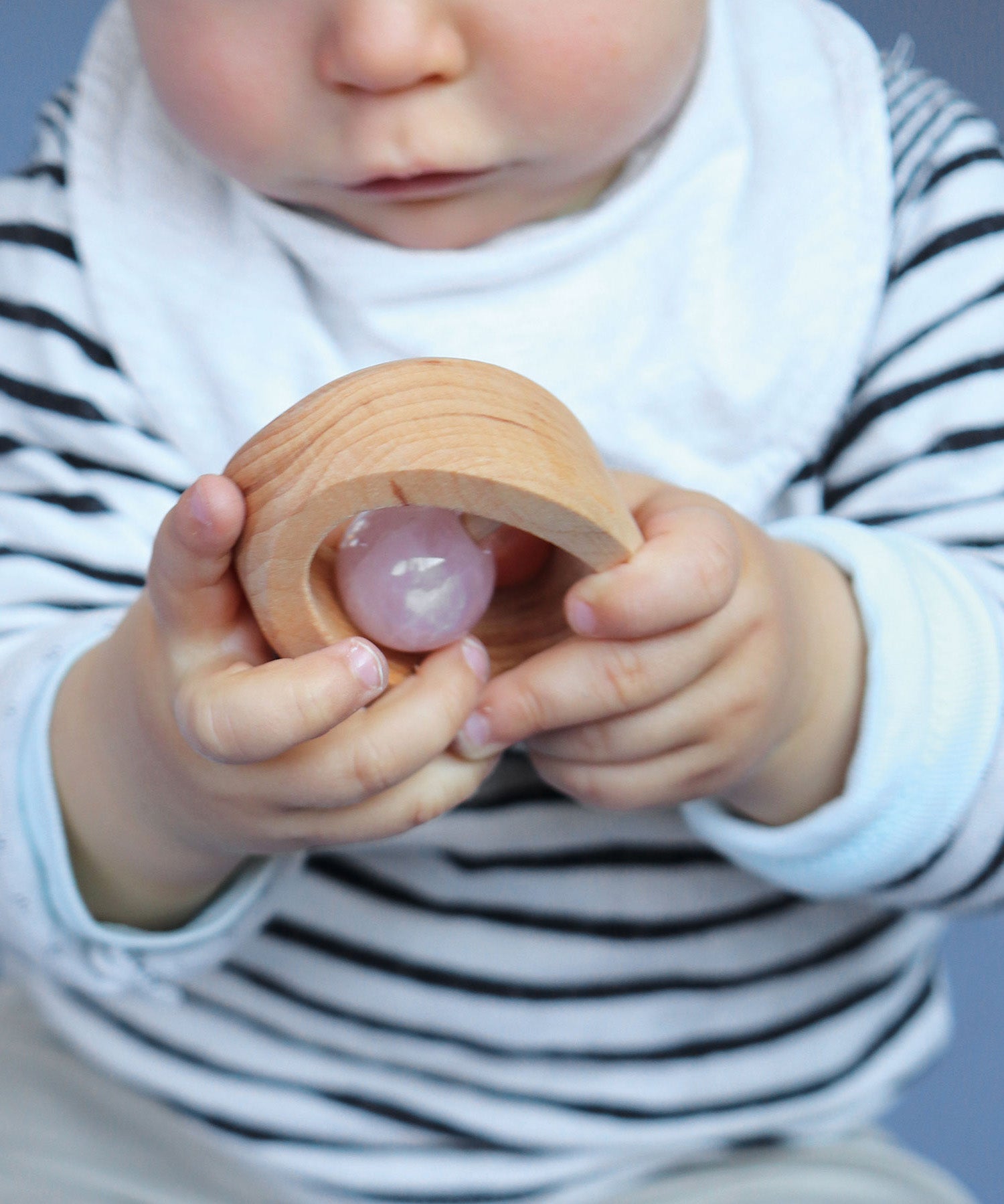 I ordered this and a couple of other bits for my 3 month old baby as she has started to show an interest in the world around her. It’s a truly beautiful little rattle. It makes a satisfying clunking noise, the quartz is almost glowing/sparkling and the wood is very smooth and tactile. I look forward to watching my baby develop and play with it more over the coming months.