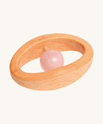 • Made up of a chunky wooden oval shaped rattle with a semi precious rose quartz in the middle.