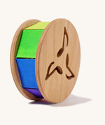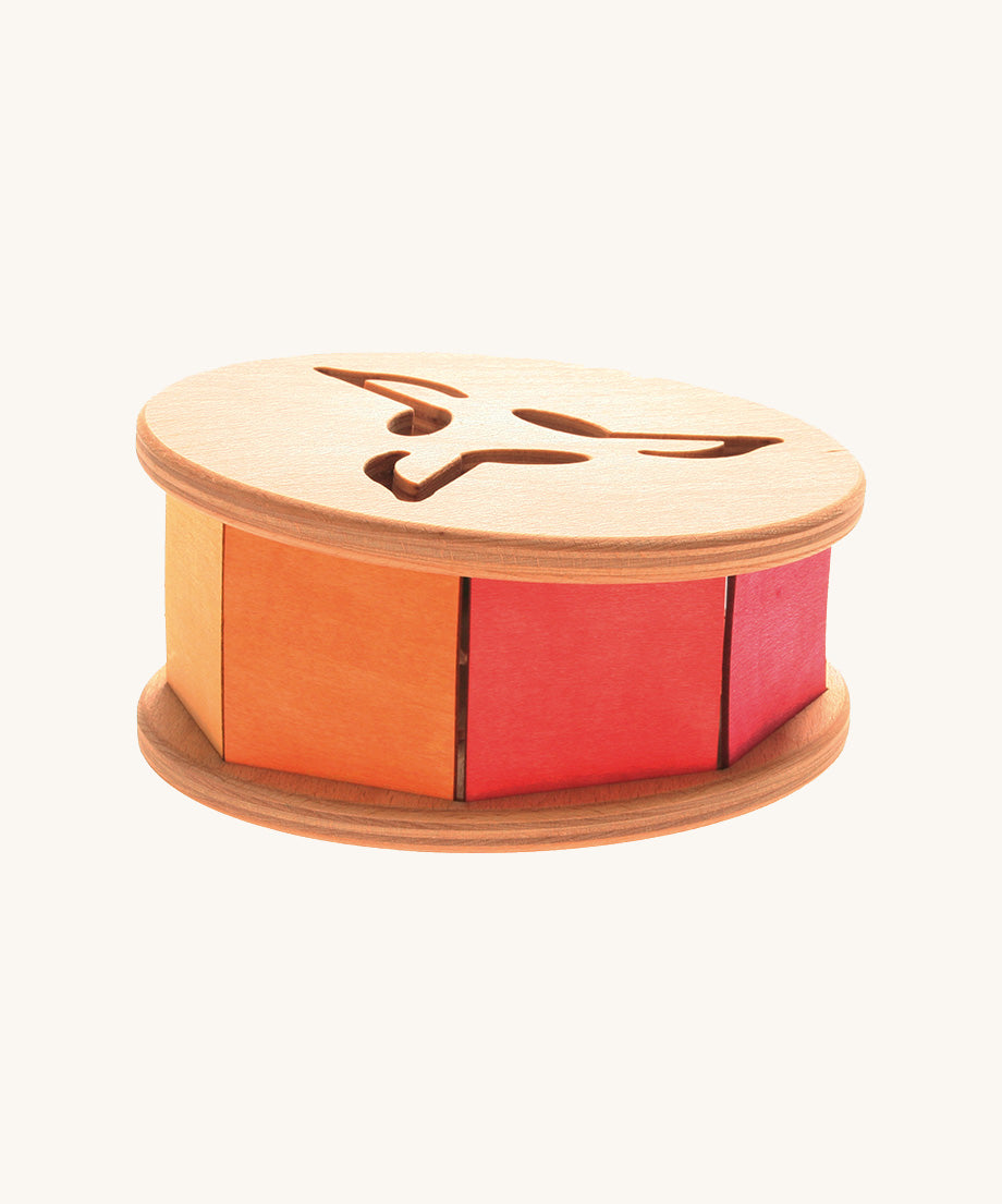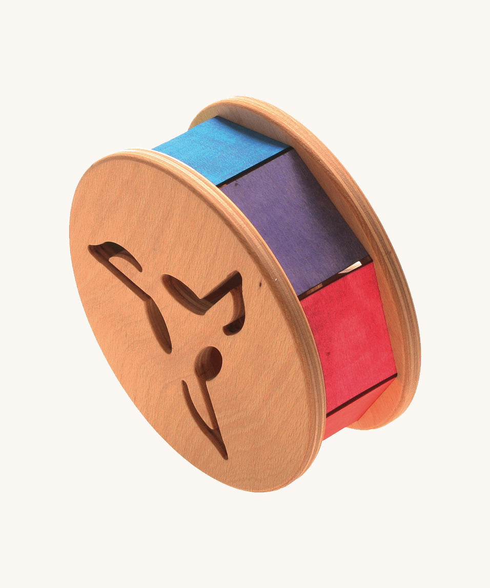 This rolling toy spins the colours of the rainbow as it rolls along and makes a gentle clattering sound as the wooden marble inside rattles against the sides. Designed to stimulate baby's senses and encourage them to chase, crawl or walk after it as the push it. Little ones will enjoy shaking it and rolling it around to hear the noise and see the pretty colours. Musical notes shapes are cut into the sides.