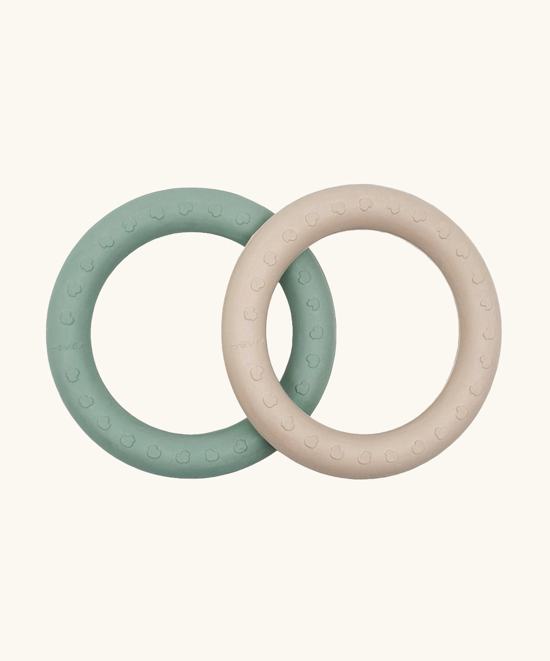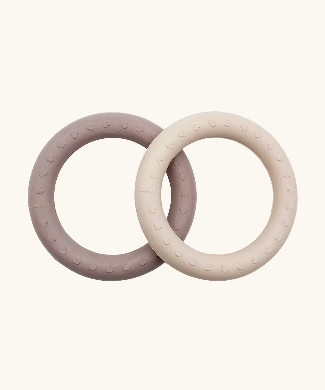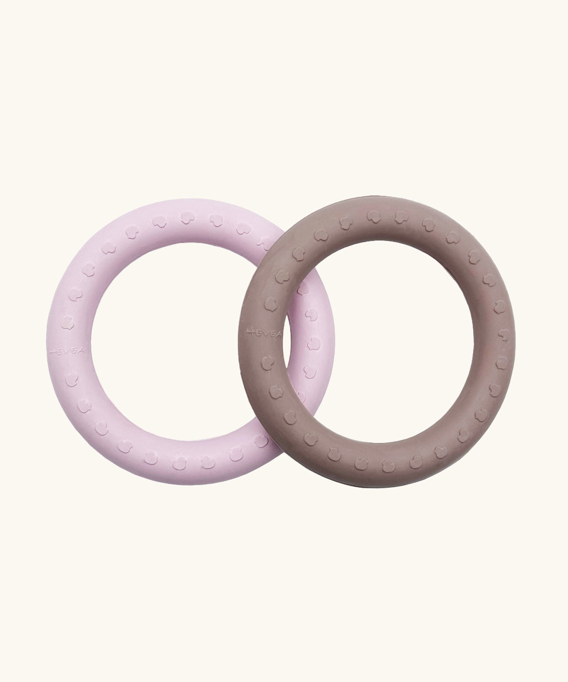 Made from 100% natural rubber, the Hevea Teether Ring Set is a pack of two sensory teething toys by Hevea to soothe irritated, teething baby gums. The Teether Ring is easy to grip in little hands with its raised texture of little ducks around the edge. Choose from a range of lovely soft pastel shades.