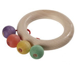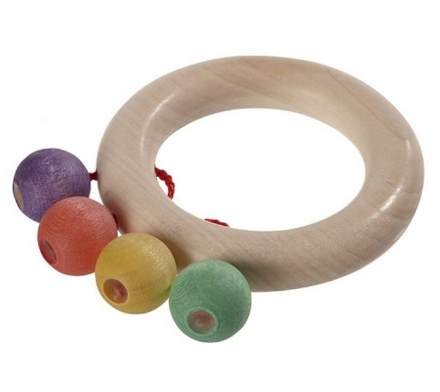 This natural wooden teether is a classic baby toy that will engage with babies' senses. This wooden teething ring is made up of a natural ring with four small coloured beads threaded onto it. Tots will enjoy rolling the beads between their fingers, grasping the ring and giving it a shake to hear a gentle rattling sound. Ethically made, simple and hand-crafted, this baby teether is a lovely first sensory toy.