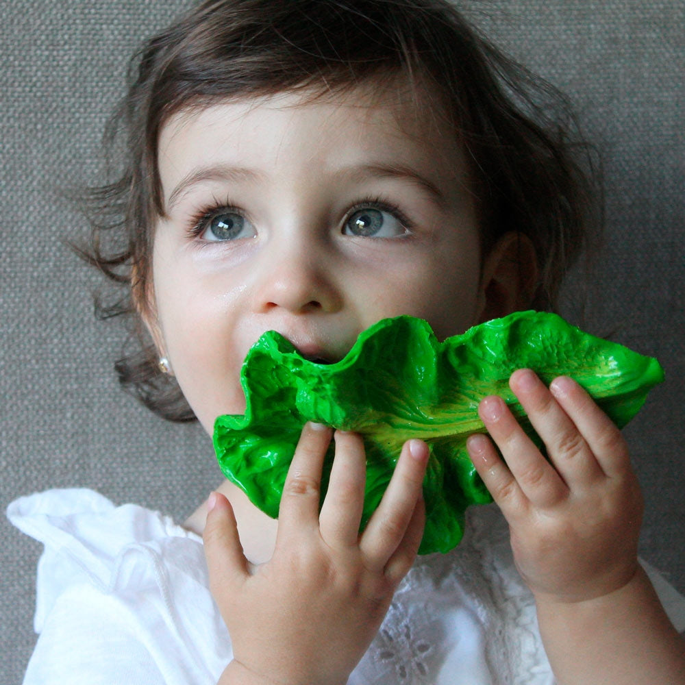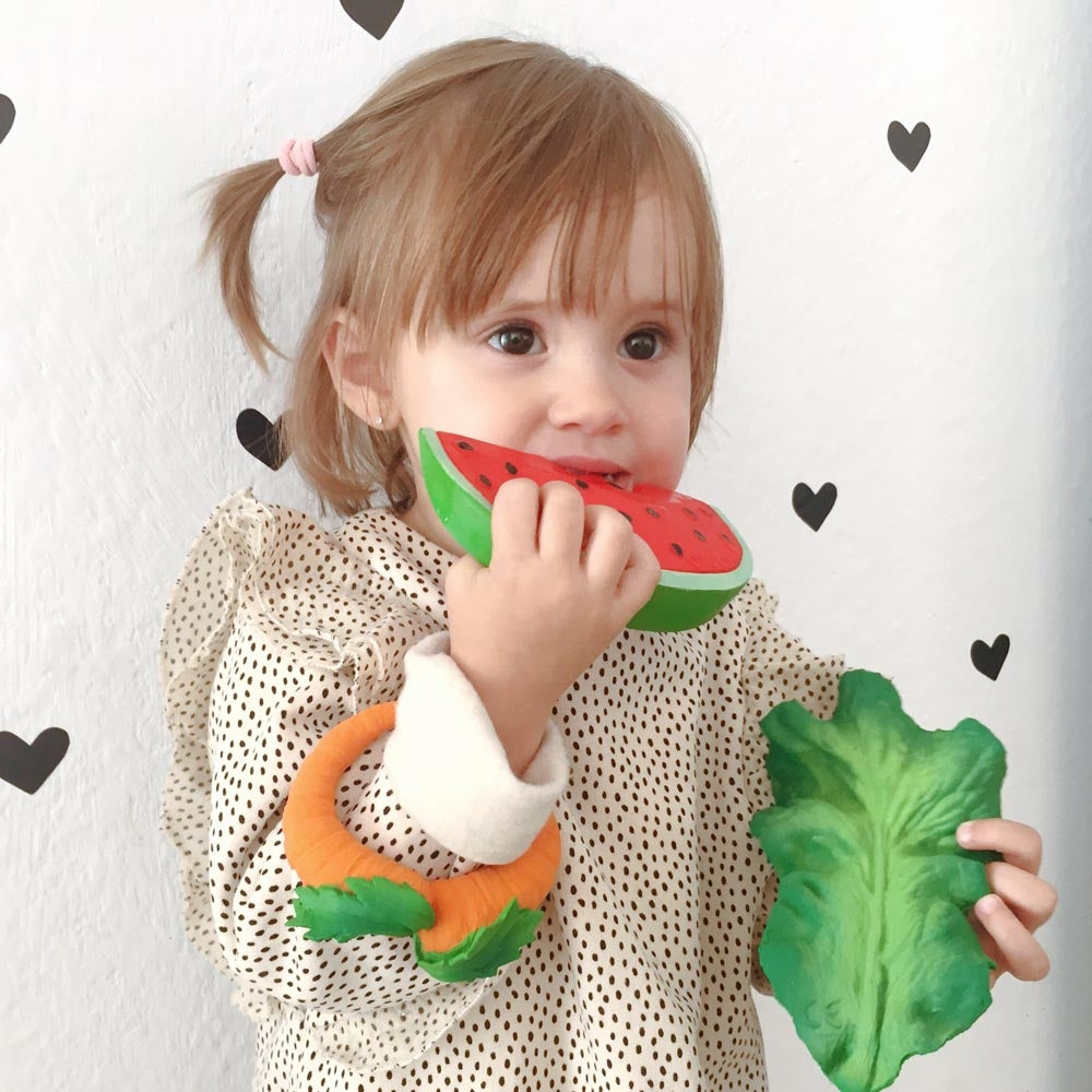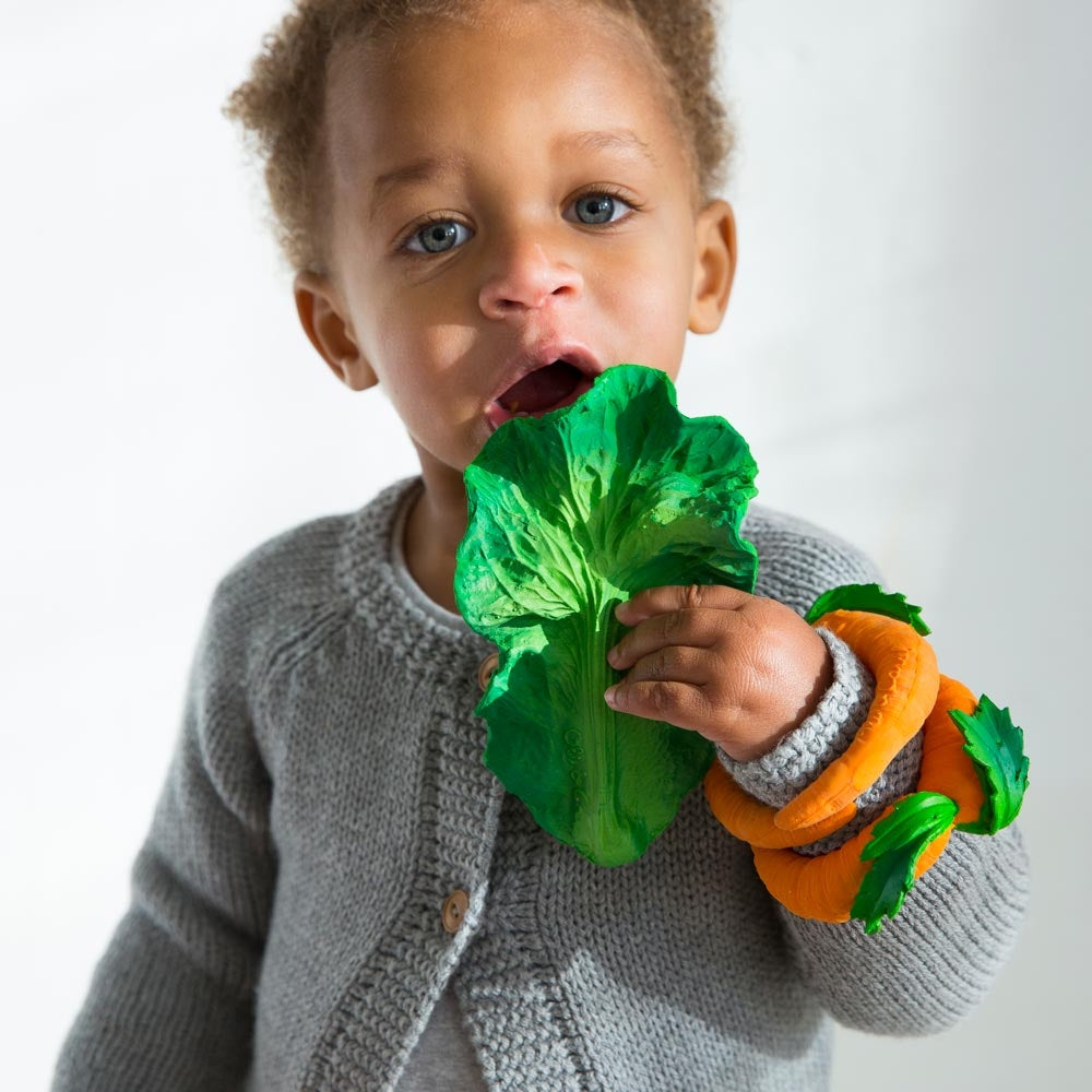 Introduce a love of fruit and veggies from an early age! Kendall the Kale from Oli & Carol is soft and chewable 100% natural rubber toy for teething babies, and will be loved by older children in their play kitchen and shops.