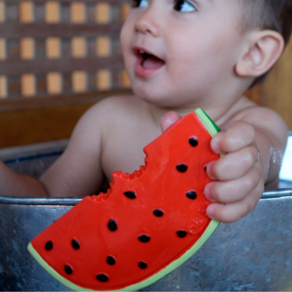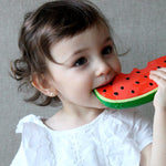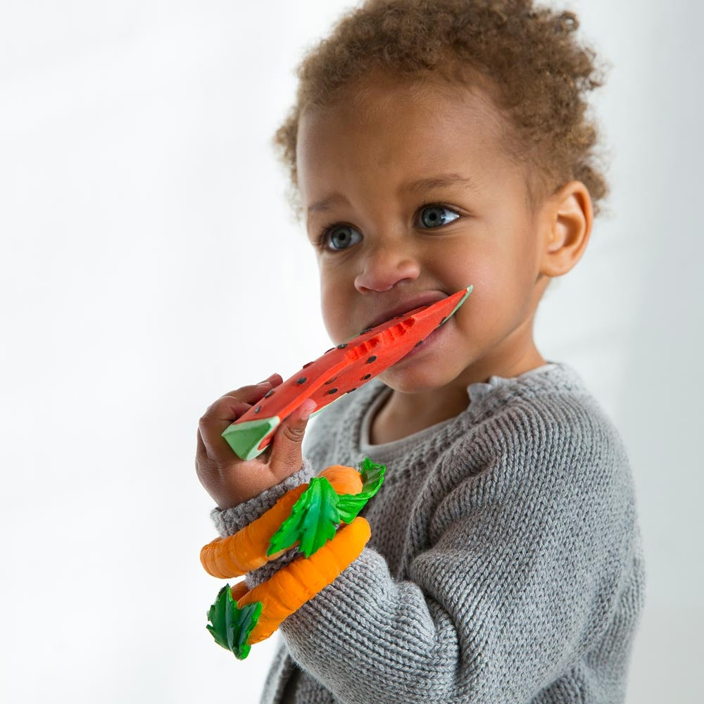 Introduce a love of fruit and veggies from an early age! Wally the Watermelon from Oli & Carol is soft and chewable 100% natural rubber toy for teething babies, and will be loved by older children in their play kitchen and shops.