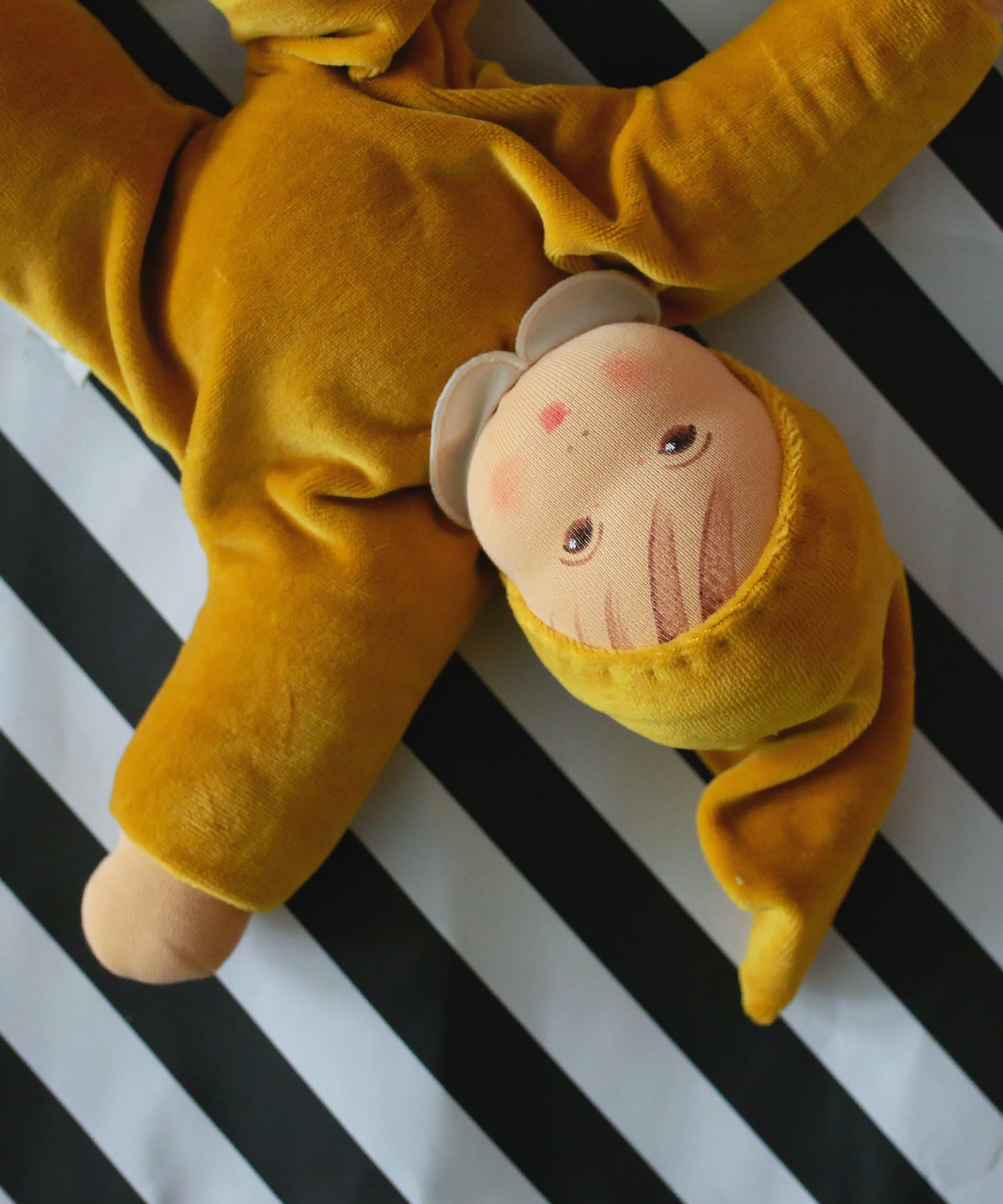 A lovingly handmade Waldorf doll, Nanchen Nani is the perfect first doll for babies, soft, cuddly, and made from organic materials. With a golden yellow organic cotton velour sleepsuit with a white collar and matching hat, this natural Waldorf doll is gently stuffed by hand with Bioland-certified organic sheep wool and has a unique handpainted face, ensuring no two dolls are the same.