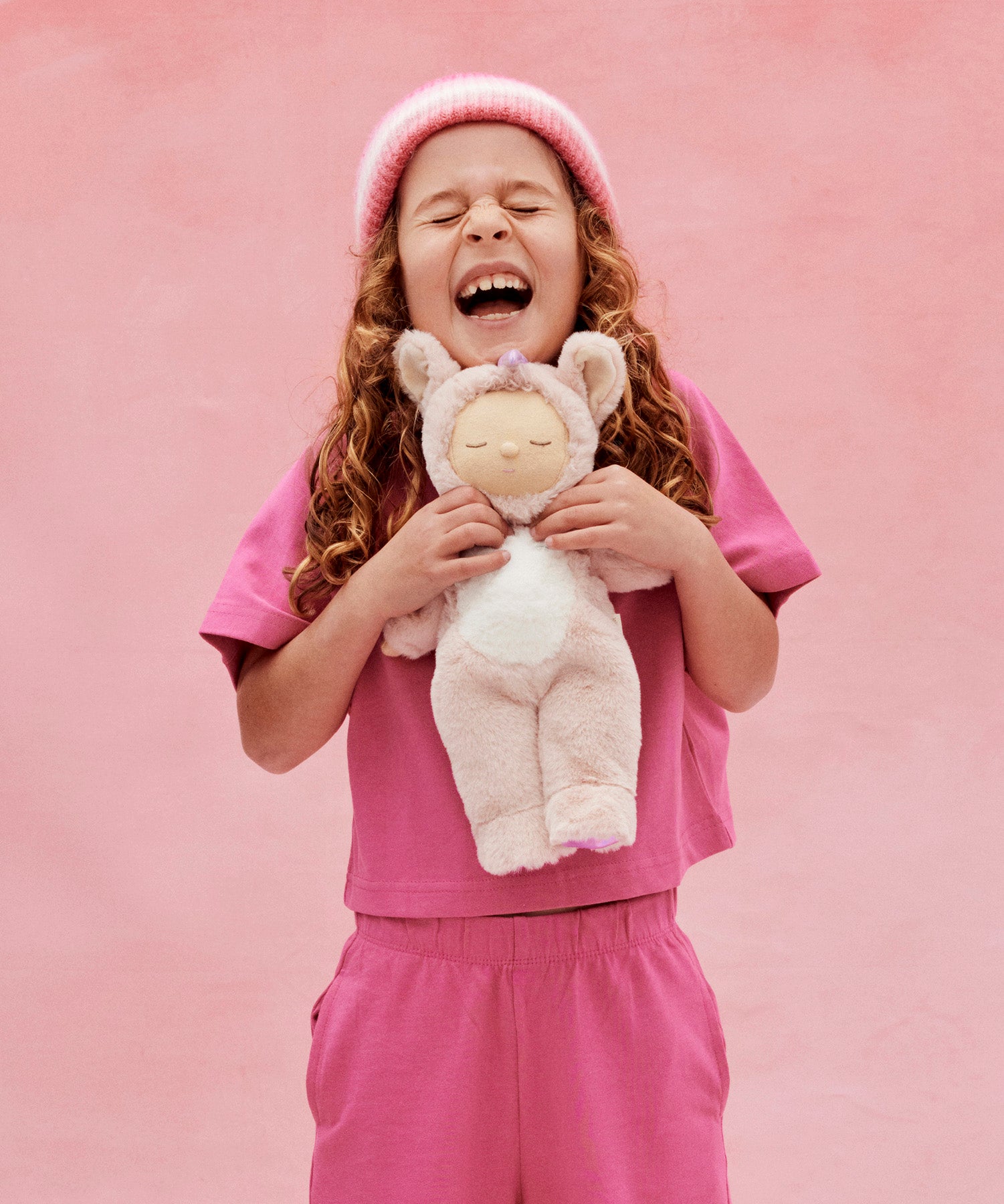 A child holding the pink fluffy Olli Ella dinkum doll