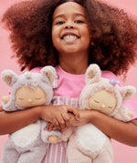 A child holding the lilac and pink fluffy Olli Ella dinkum dolls