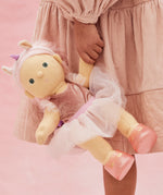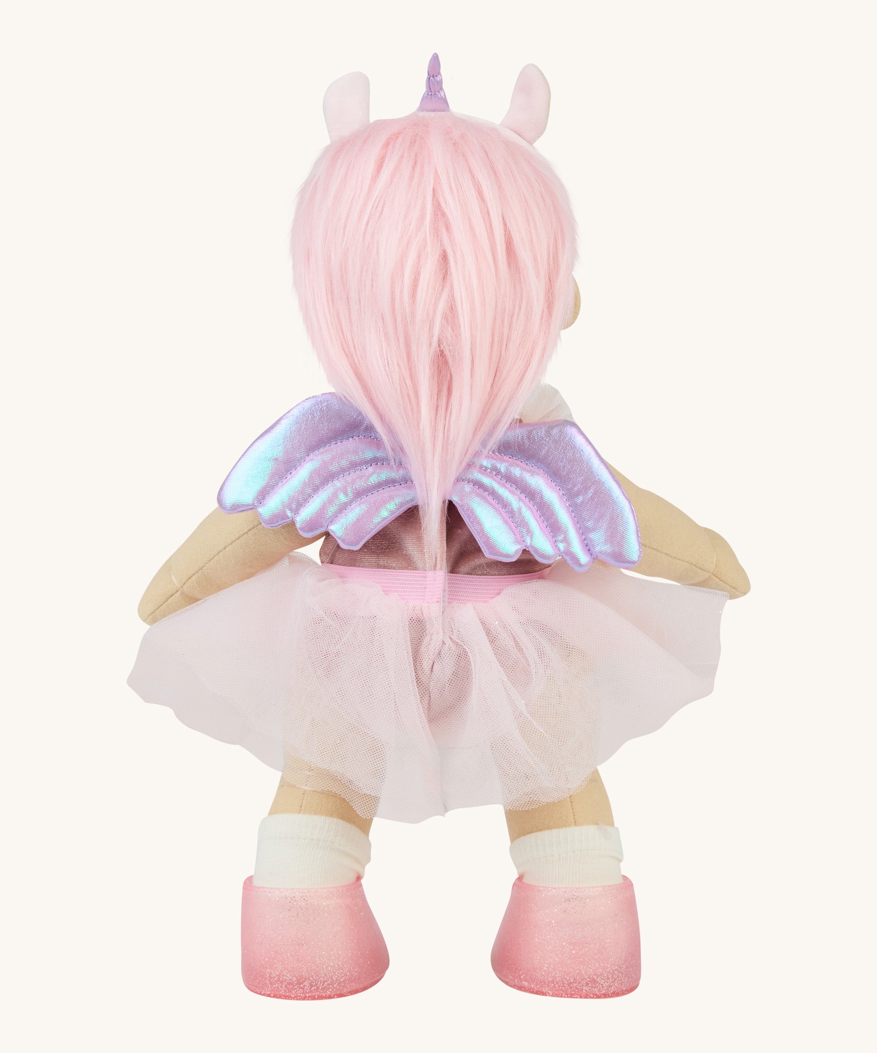 Magical adventures await with Pixie, a posable Olli Ella Dream Dinkum Doll with a fabulous unicorn outfit. Pixie has long pale pink hair and wears a removable pink velvet bodice with iridescent purple Pegasus wings and a glittering tulle tutu, a doll headband with adorable unicorn ears and an iridescent purple unicorn horn, white socks and sparkling pink shoes. Perfect for bedtime cuddles and playtime adventures too.
