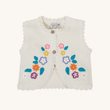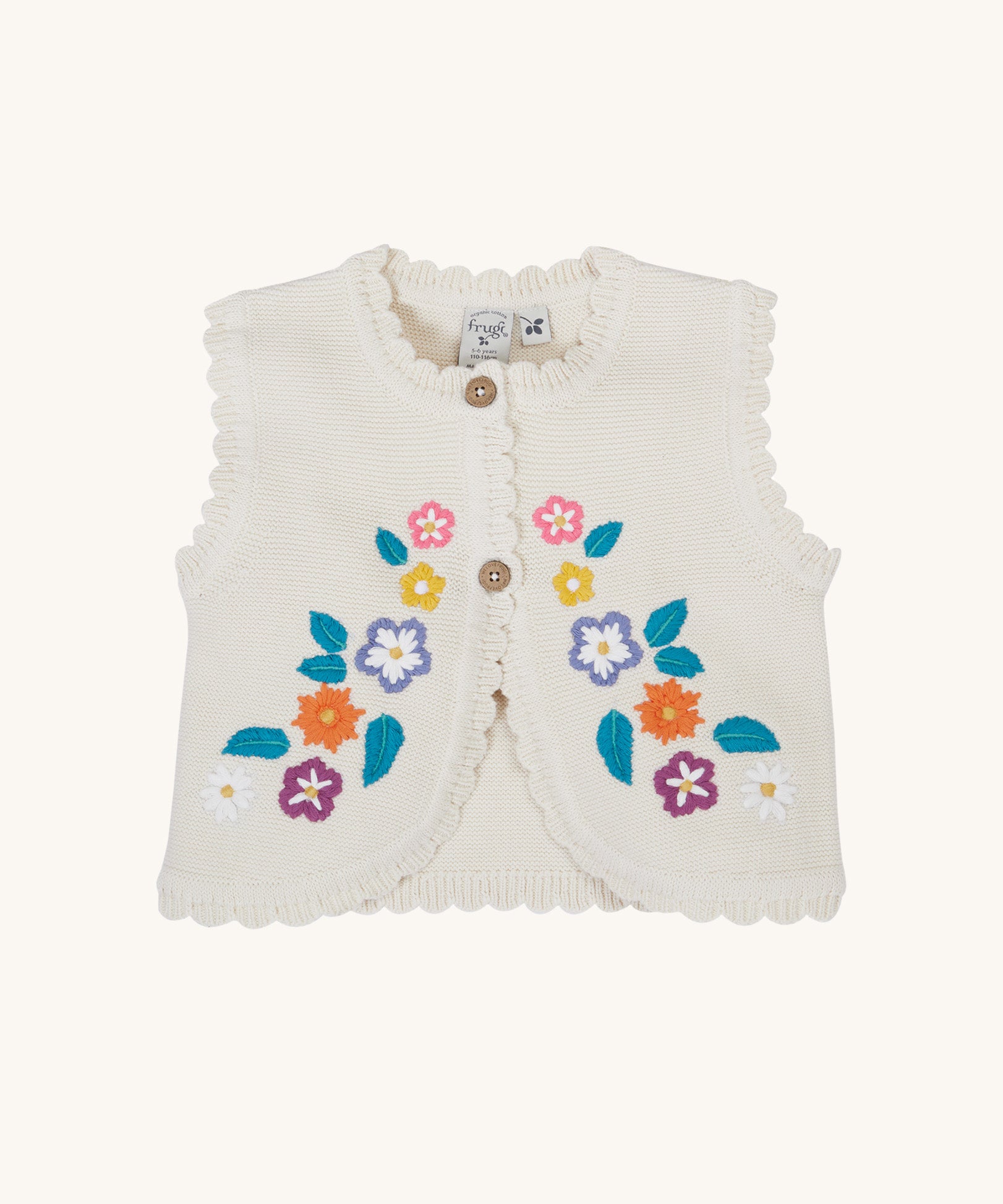 Frugi Oatmeal Flowers Connie Cotton Knitted Sleeveless Cardigan. This white oatmeal sleeveless cardigan has cute scalloped edges and is decorated with pretty embroidered flowers and leaves on the front.