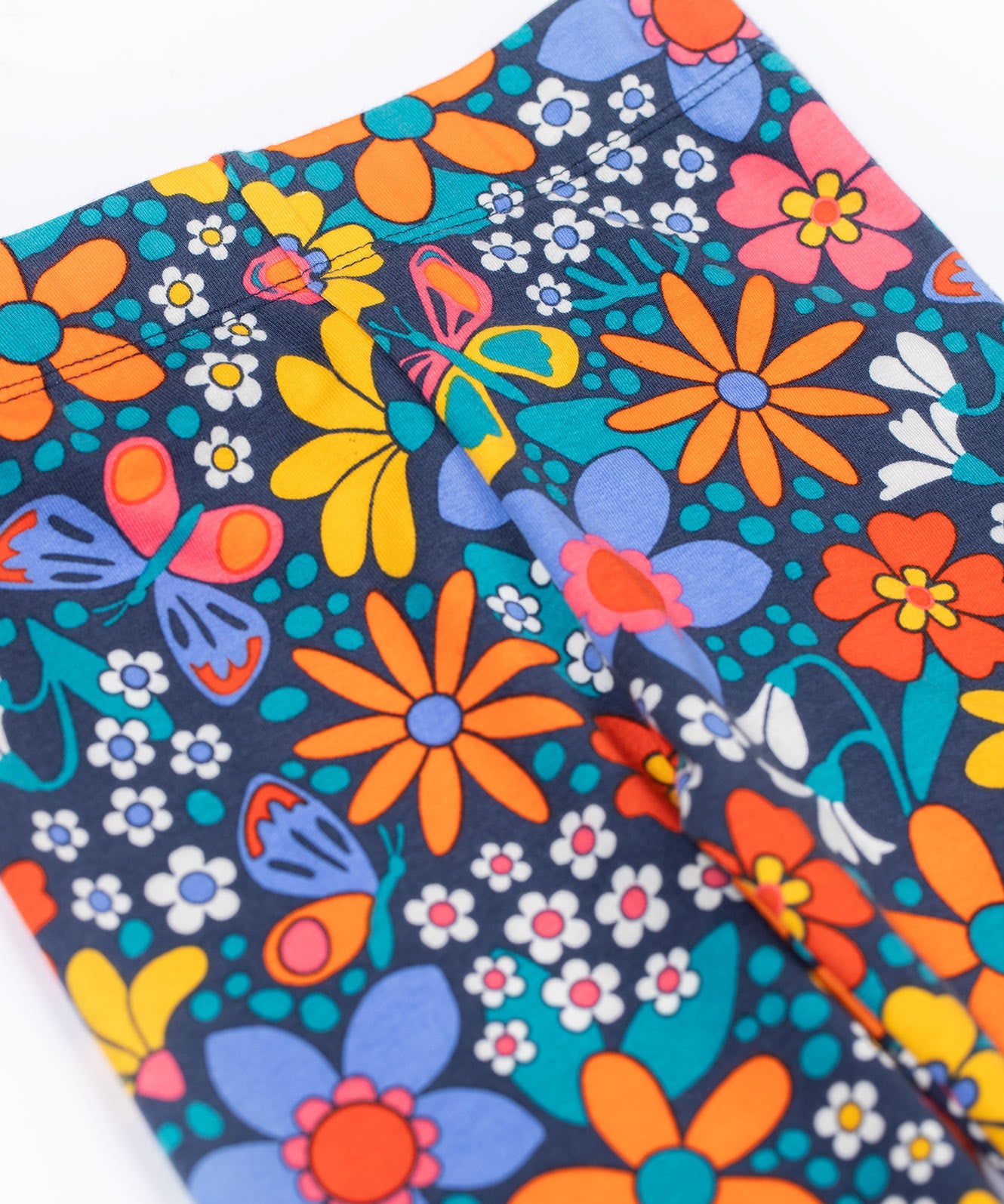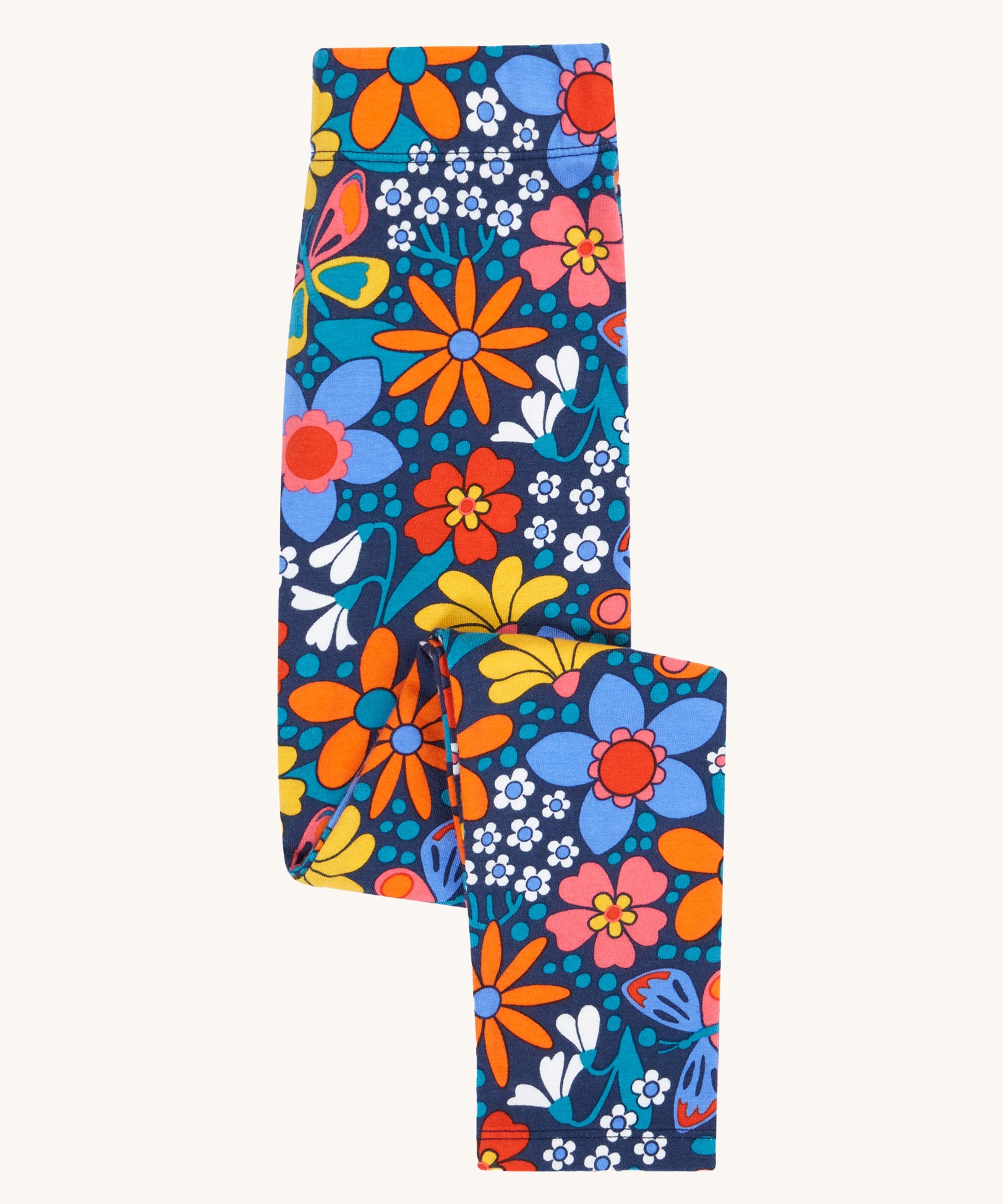 Frugi Retro Floral Leona Organic Cotton Kids' Leggings. A navy coloured legging with a bright multicoloured retro style flower print all over. These leggings are part of a wide range of organic cotton clothing for children available here at Babipur.