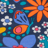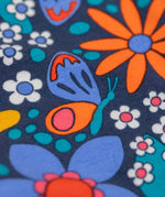 A close up of the print on the Frugi Retro Floral Leona Organic Cotton Kids' Leggings. A navy coloured legging with a bright multicoloured retro style flower print all over. These leggings are part of a wide range of organic cotton clothing for children available here at Babipur.