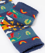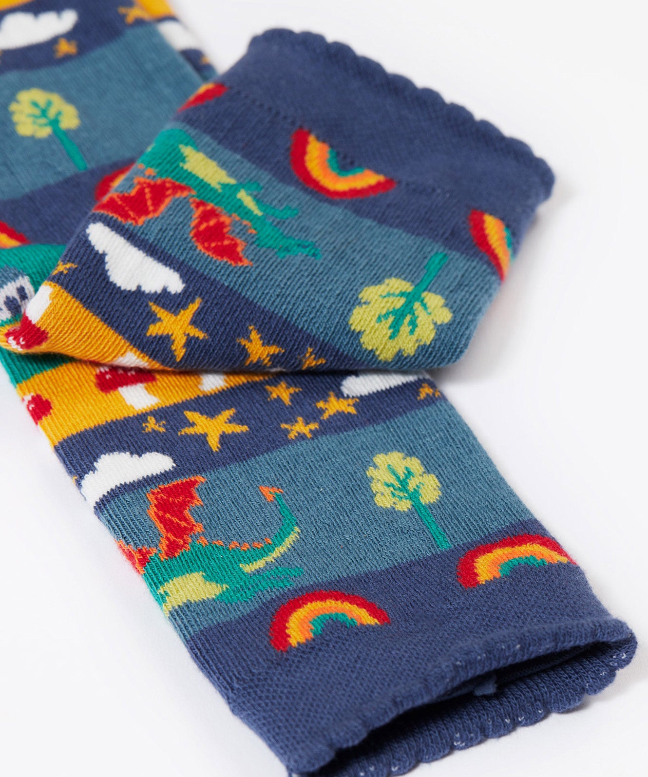 These organic cotton footless leggings are soft, stretchy and designed with babies and toddlers in mind. The Fair Isle inspired pattern features castles, rainbows, stars and toadstools in bright, cheerful colours. On the bum, a friendly green dragon with red wings adds extra character, making nappy changes that bit more playful. The elasticated waistband ensures a snug yet flexible fit, while the footless design leaves toes free to wriggle in socks or slippers.
