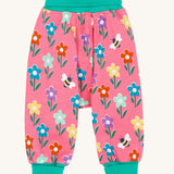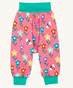 Frugi fun flowers print parsnip pants children's organic cotton trousers. The fun flowers print features multi-coloured flowers and bees on a pink background with turquoise coloured waistband and leg cuffs.