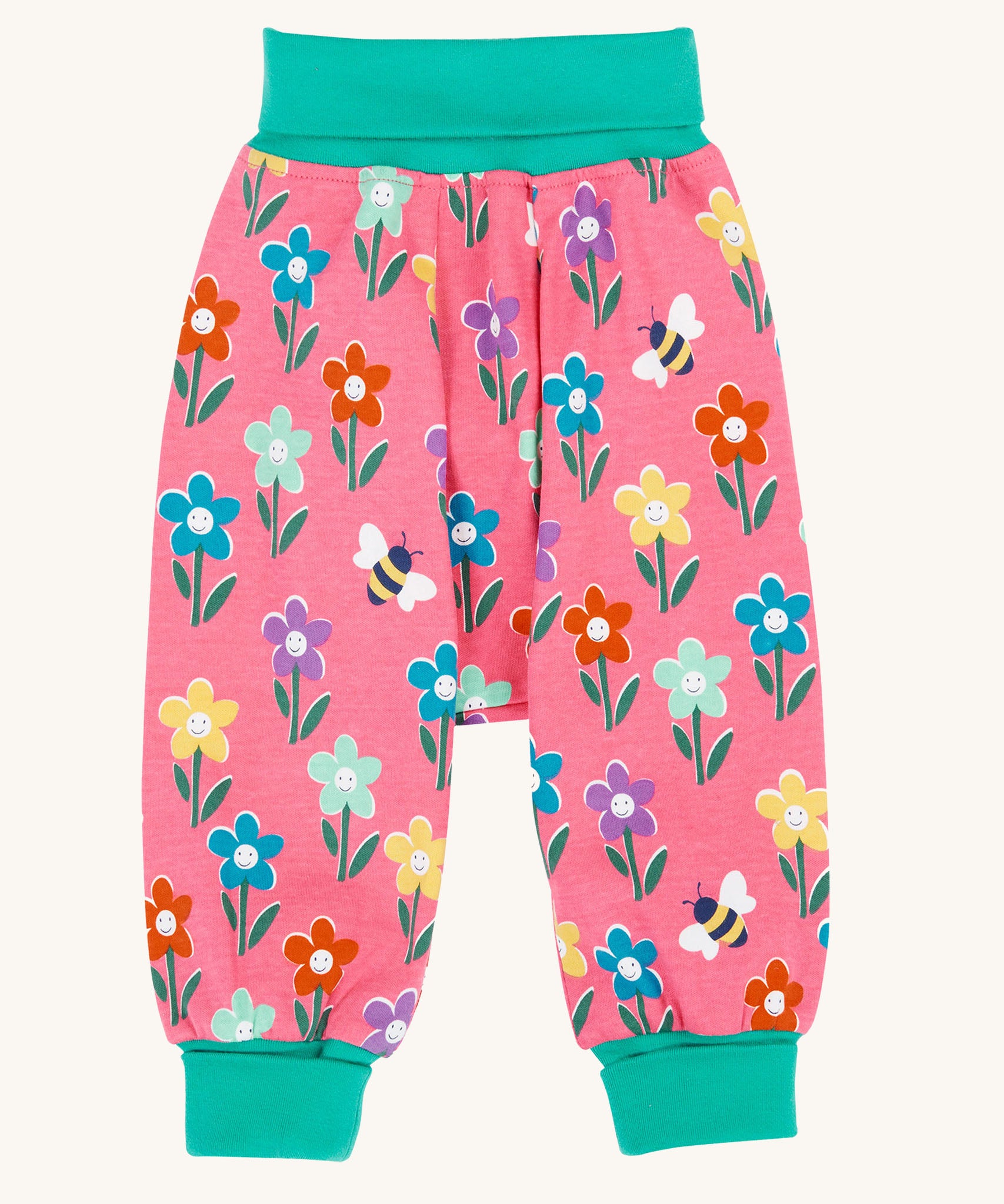 The Frugi Parsnip Pants in a Fun Flowers print are a comfy essential for growing little ones. Made from beautifully soft GOTS-certified organic cotton, these baby and toddler trousers are printed with colourful, smiling flowers and busy bees on a pink base.