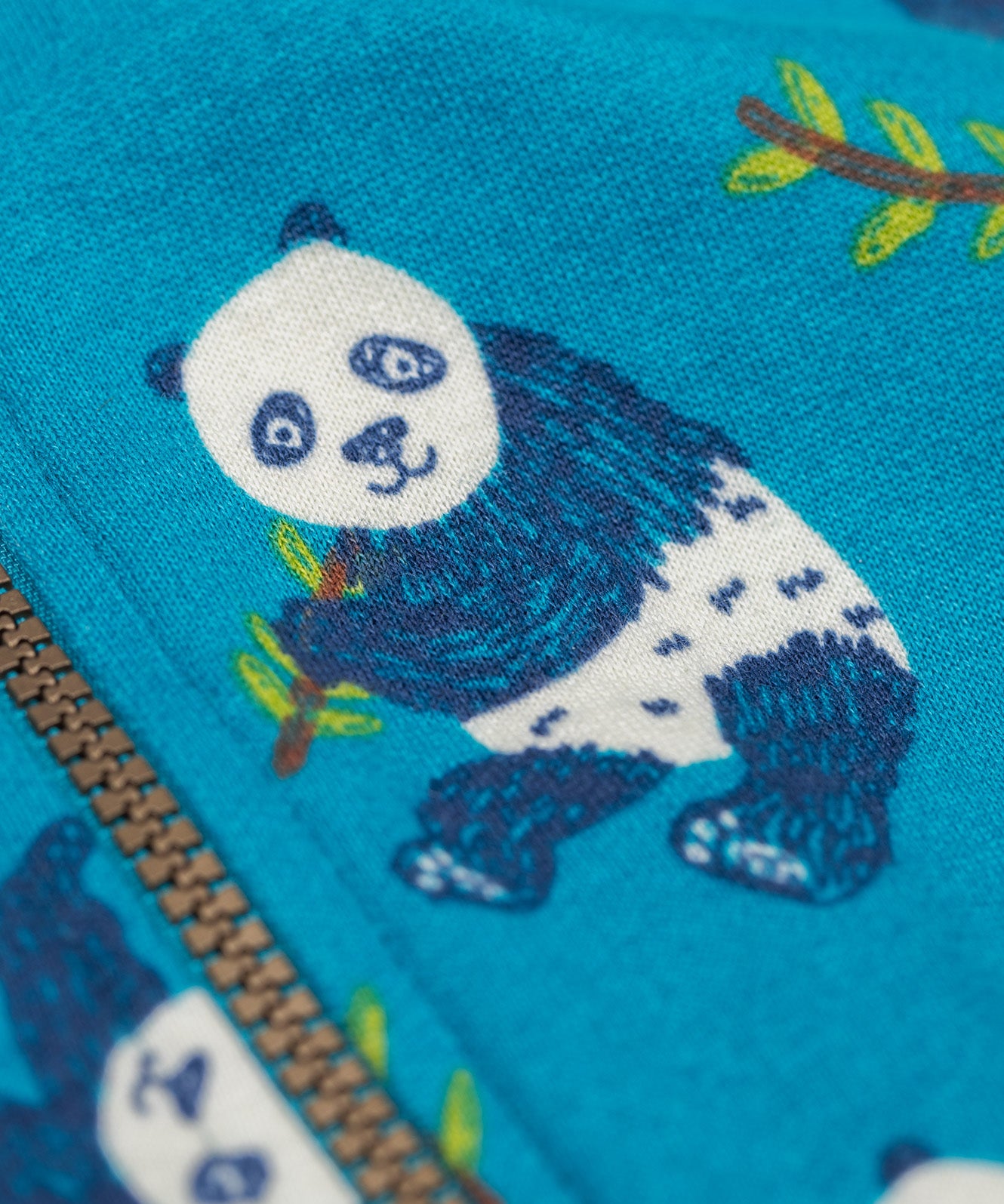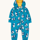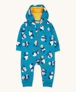 Frugi snuggle suit in panda pals available at Babipur. A GOTS organic cotton light blue hooded all in one with a playful panda design. Features a full length zip fastener.