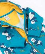 Made from GOTS-certified organic cotton brushback fleece, this snuggle suit is gentle on sensitive skin, breathable, and sustainably made. The bright blue base is covered in playful panda pals, with a warm yellow lining inside the hood for extra cosiness. A full-length zip fastening with a protective chin guard makes dressing quick and fuss-free, while ribbed cuffs at the wrists and ankles help lock in warmth.