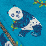A close up of the front zip closure on the Frugi snuggle suit in panda pals available at Babipur. A GOTS organic cotton light blue hooded all in one with a playful panda design. Features a full length zip fastener.