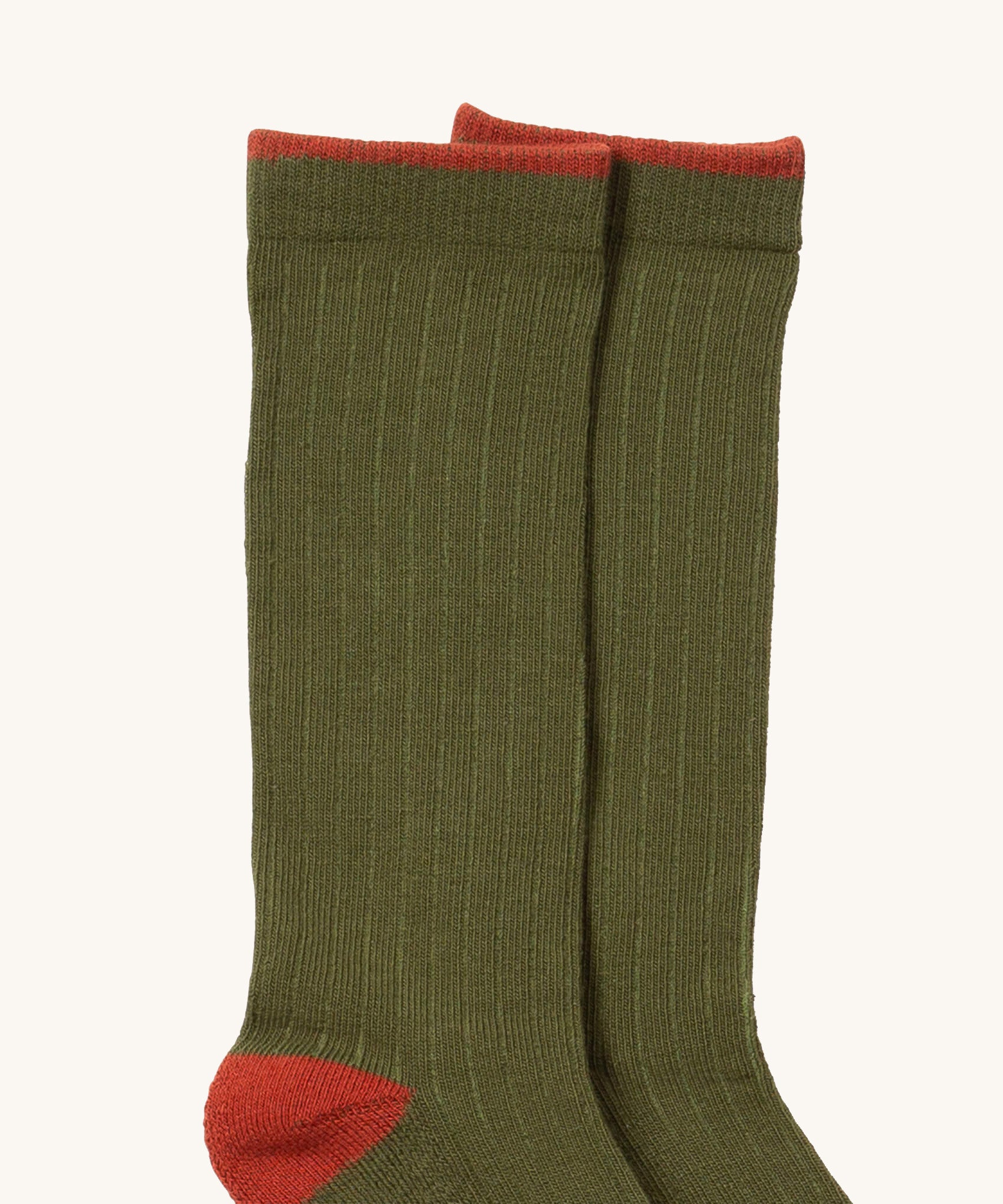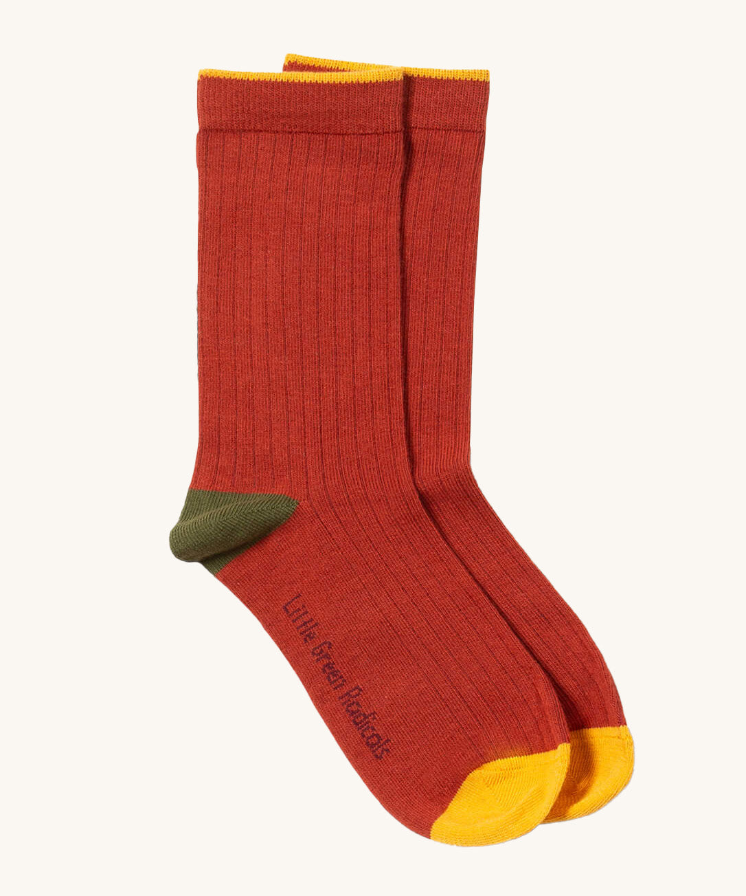 Little Green Radicals red block ankle socks from the golden leaves set available at Babipur. A soft ribbed GOTS organic cotton sock with green and yellow trim