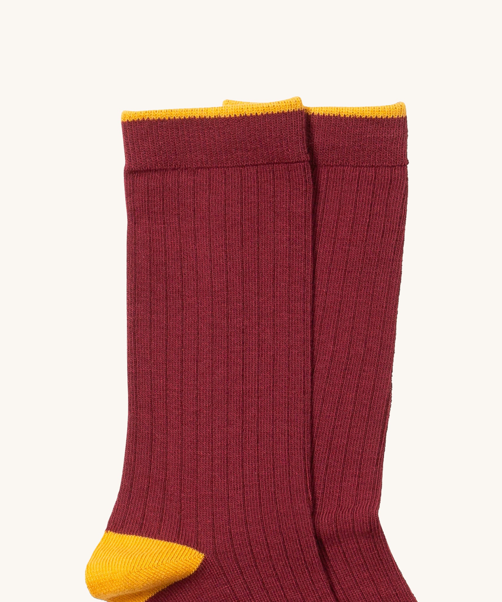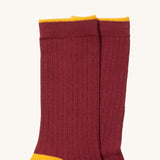 A close up of the maroon Little Green Radicals ankle sock. Showing the soft ribbed stitch and yellow trim on organic cotton fabric.