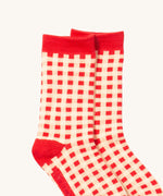 A close up of the red and white checked Little Green Radicals ankle socks check detail with red trim on organic cotton fabric.