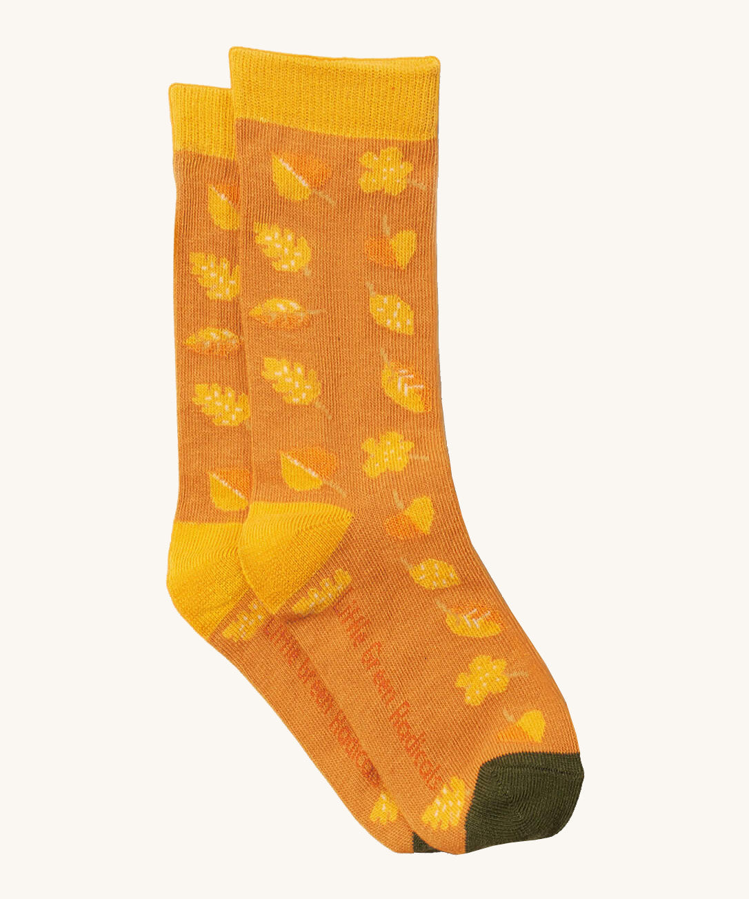 Little Green Radicals golden leaves ankle socks available at Babipur. A GOTS organic cotton sock with a autumn inspired leaves design and a green toe trim