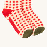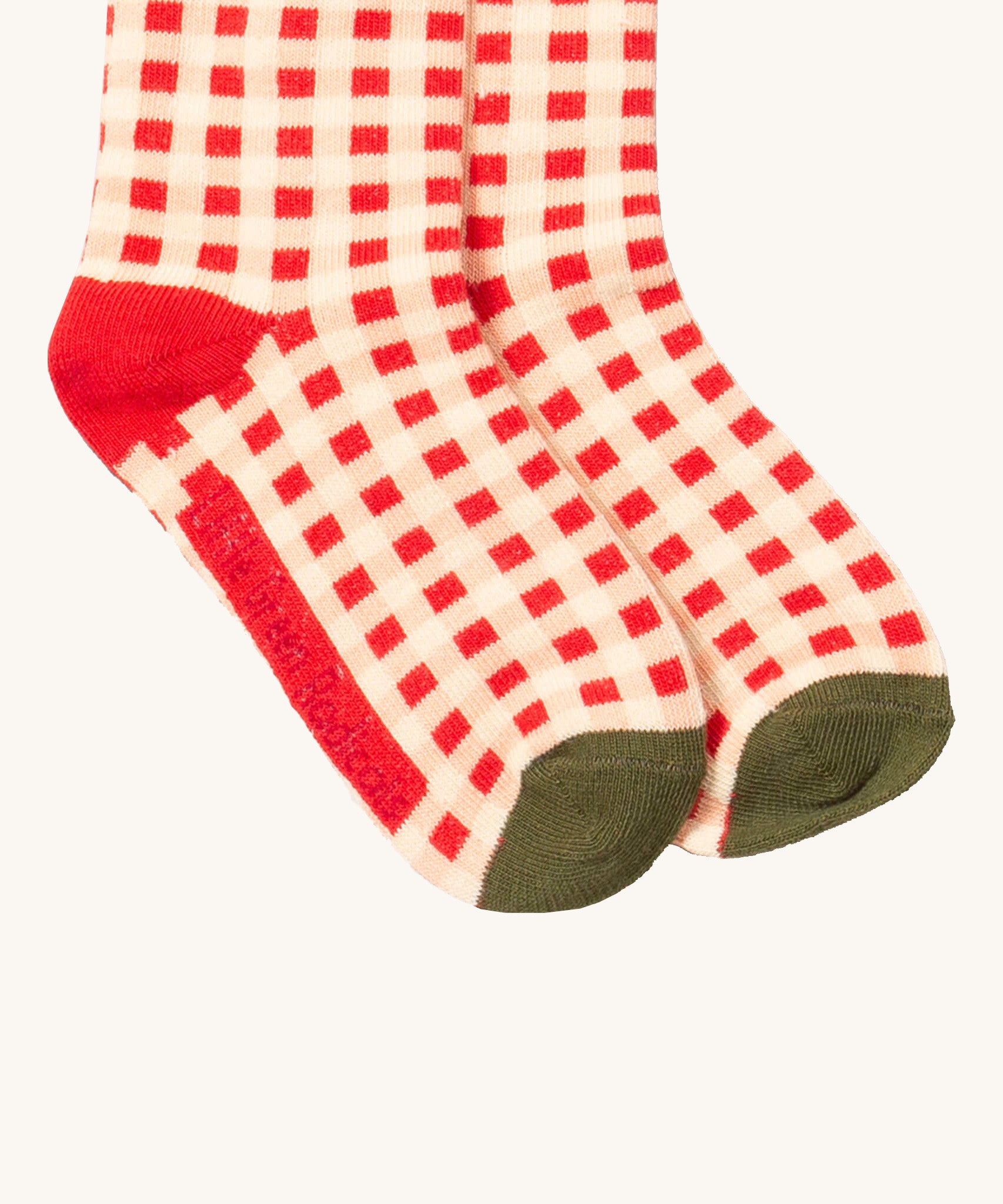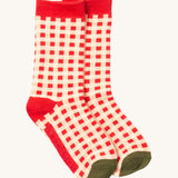 Little Green Radicals red and white check ankle socks from the golden leaves set available at Babipur. A GOTS organic cotton sock with a check design with red and green trim.