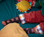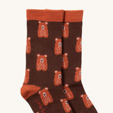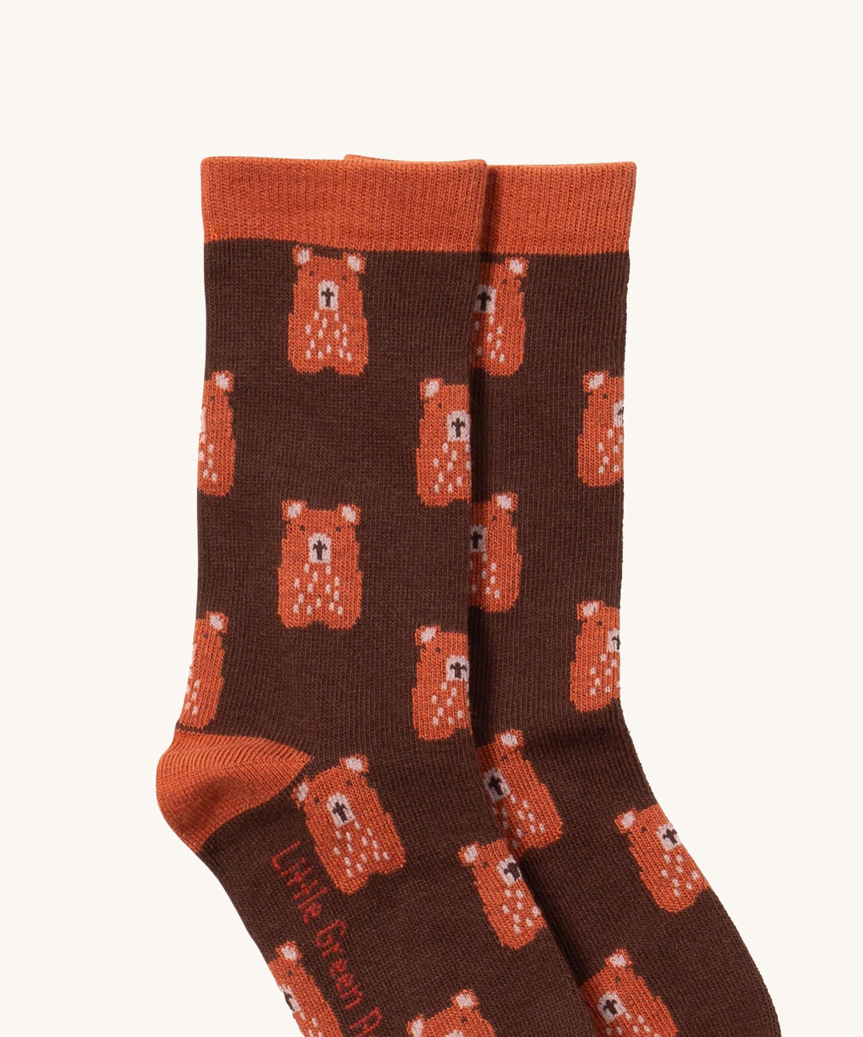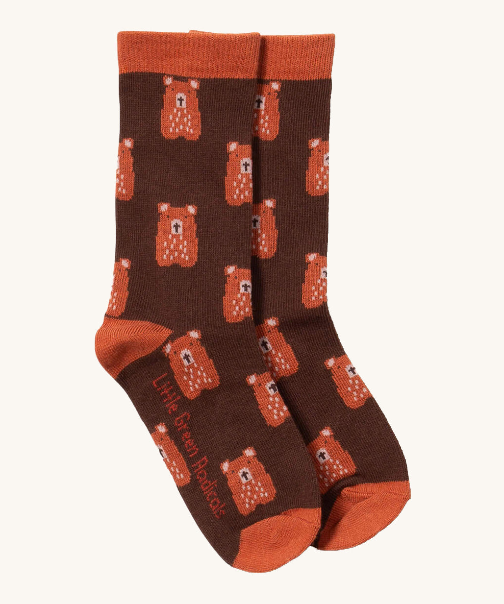 Little Green Radicals teddy bear ankle socks from the teddy bear set available at Babipur. A dark brown GOTS organic cotton sock with cute teddy bears and light brown trim