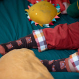 Designed for small feet and big adventures, the Little Green Radicals Kids' Ankle Socks in Teddy Bear are a pack of 3 pairs of comfy socks in rich autumnal colours. They all have stretchy ribbed cuffs to keep them in place and contrasting colour toes and heels. There is one block colour pair in blue rib, and two printed pairs in a blue check pattern and an adorable brown teddy bear pattern on dark brown. These soft, warm socks won't restrict natural foot movement and have non-slip silicone stars in sizes 0-2 years to help new walkers.