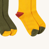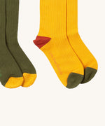 A close up of the yellow block Little Green Radicals ankle socks showing the red and green toe trim detail on soft ribbed organic cotton fabric