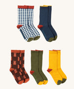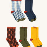 Little Green Radicals teddy bear ankle socks 5 pack available at Babipur. A GOTS organic cotton sock multipack includes a blue and white check, navy, yellow and green block ankle socks and a teddy bear ankle sock.