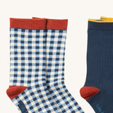Little Green Radicals blue and white gingham style organic cotton children's socks. These socks are a part of a wide range of organic cotton clothing and accessories for children available here at Babipur.