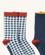 A close up of the blue and white check Little Green Radicals ankle socks showing check design with red trim detail on soft organic cotton fabric