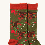A close up of the Little Green Radicals winter rabbit ankle socks. Showing the rabbit design detail and red trim with the brand name on the the sole on dark green organic cotton fabric.