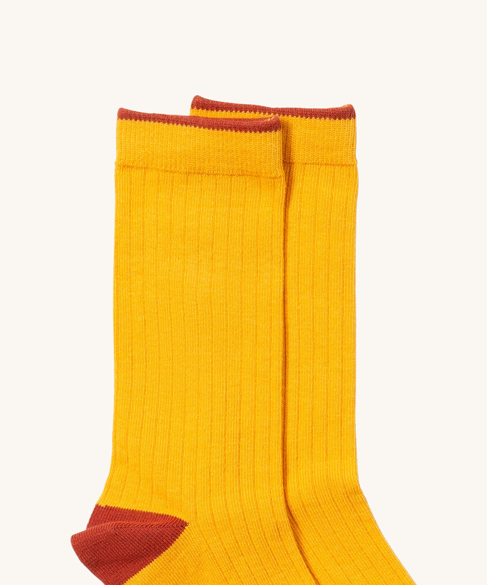 A close up of the yellow block Little Green Radicals ankle socks showing the red and green toe trim detail on soft ribbed organic cotton fabric