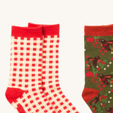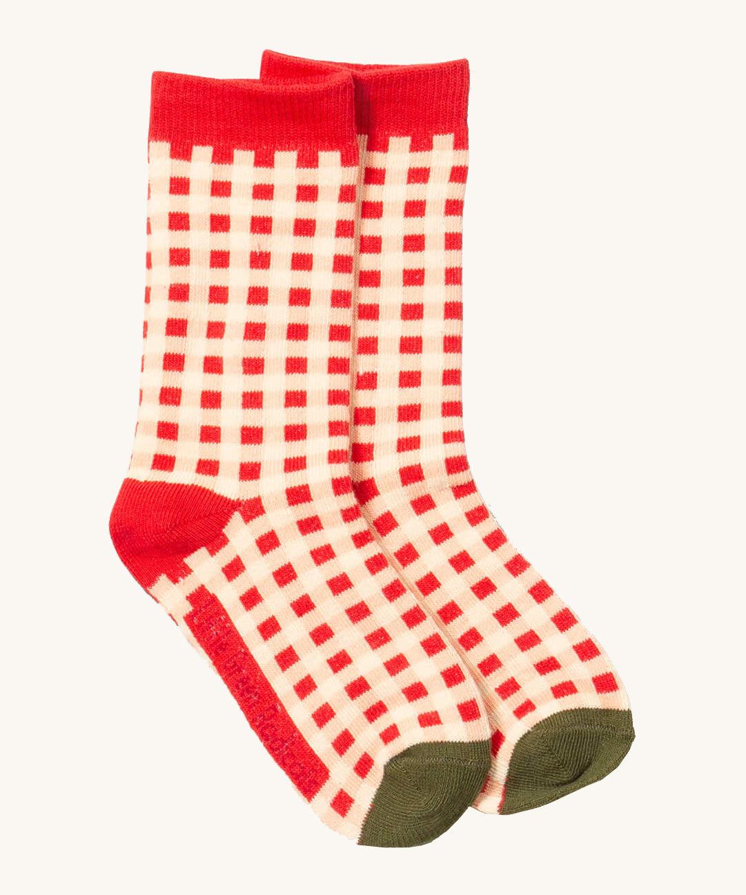 Little Green Radicals red and white check ankle socks from the winter rabbit set available at Babipur. A GOTS organic cotton sock with a check design with red and green trim.