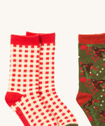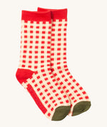 A close up of the red and white check Little Green Radicals ankle socks from the winter rabbit set showing check design with red trim detail and on soft organic cotton fabric