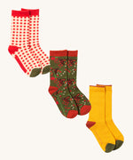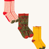 Little Green Radicals winter rabbit ankle socks  3 pack available at Babipur. A GOTS organic cotton sock multipack includes a red and white check, winter rabbit and a yellow block sock.