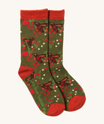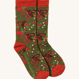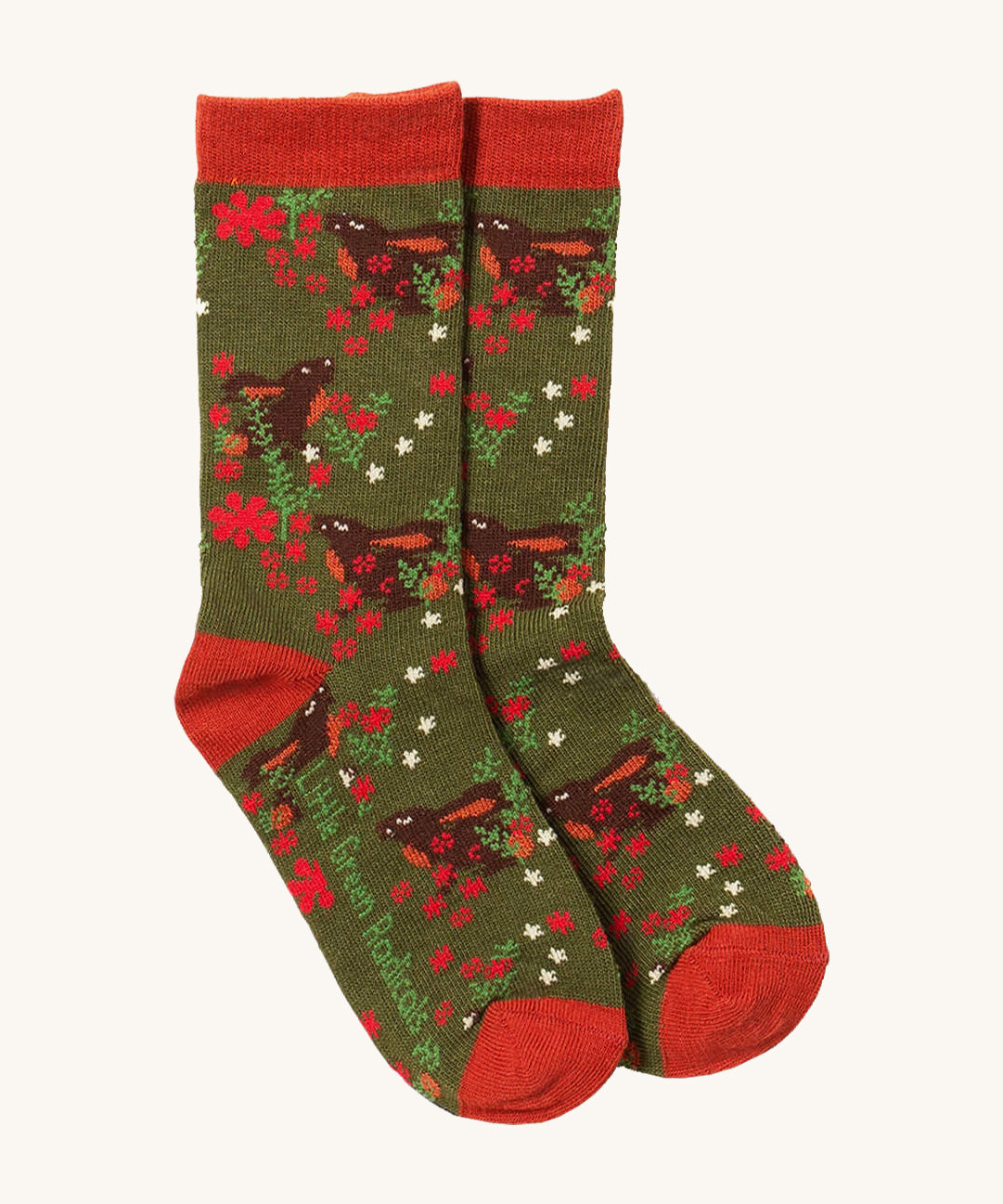 Little Green Radicals winter rabbit ankle socks available at Babipur. A dark green GOTS organic cotton sock with rabbits in flowers and red trim.
