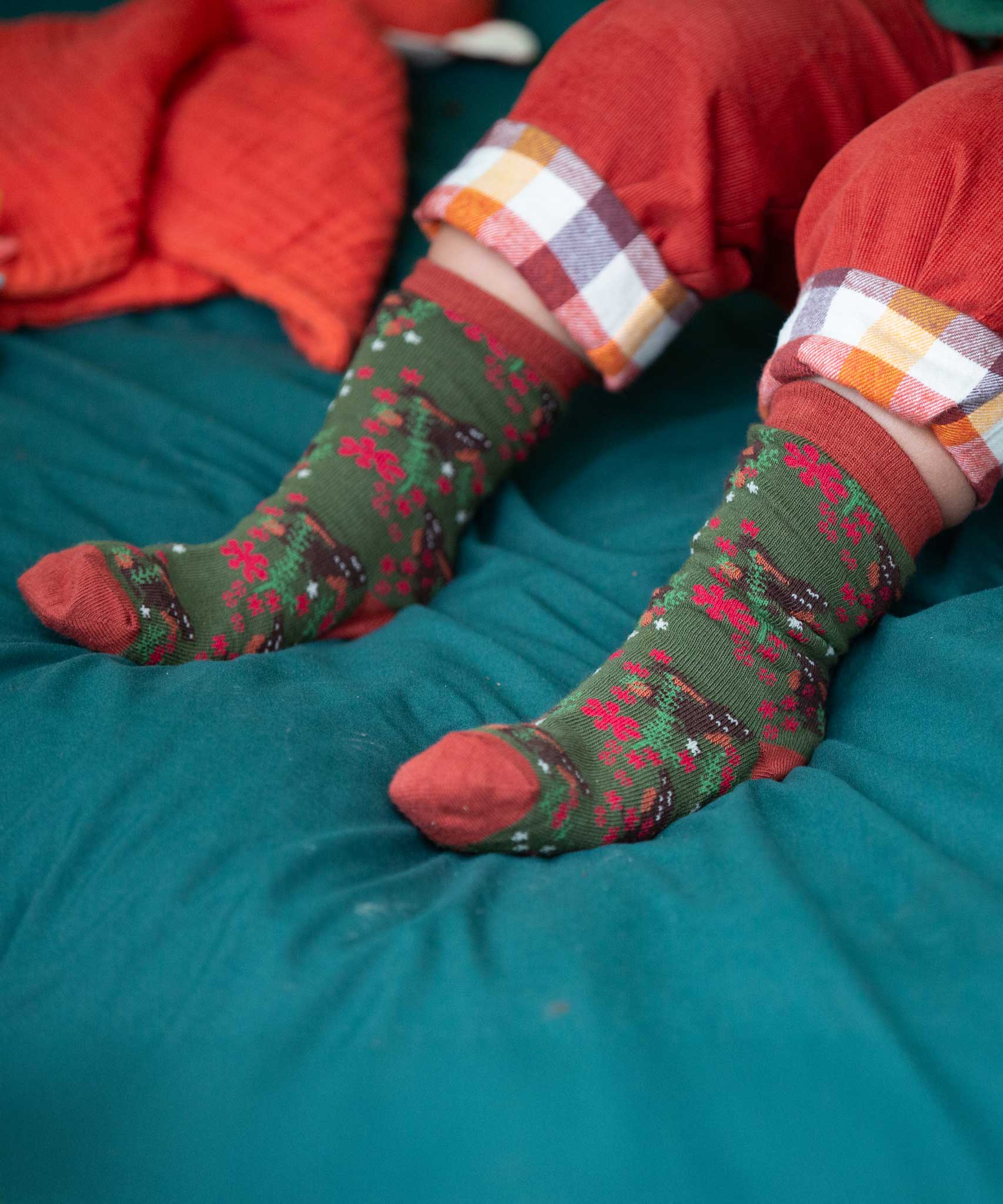 A close up of the winter rabbits design socks on a child's feet. Little Green Radicals Ankle Socks 3 Pack - Winter Rabbits. The organic cotton children's socks are a part of a wide range of organic cotton clothing for children available here at Babipur.