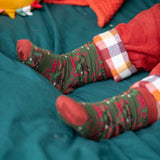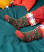Designed for small feet and big adventures, the Little Green Radicals Kids' Ankle Socks in Winter Rabbits are a pack of 3 pairs of comfy socks in rich colours. They all have stretchy ribbed cuffs to keep them in place and contrasting colour toes and heels. There is one block colour pair in golden yellow rib, and two printed pairs in red check and a beautiful winter rabbit pattern on green. These soft, warm socks won't restrict natural foot movement and have non-slip silicone stars in sizes 0-2 years to help new walkers.