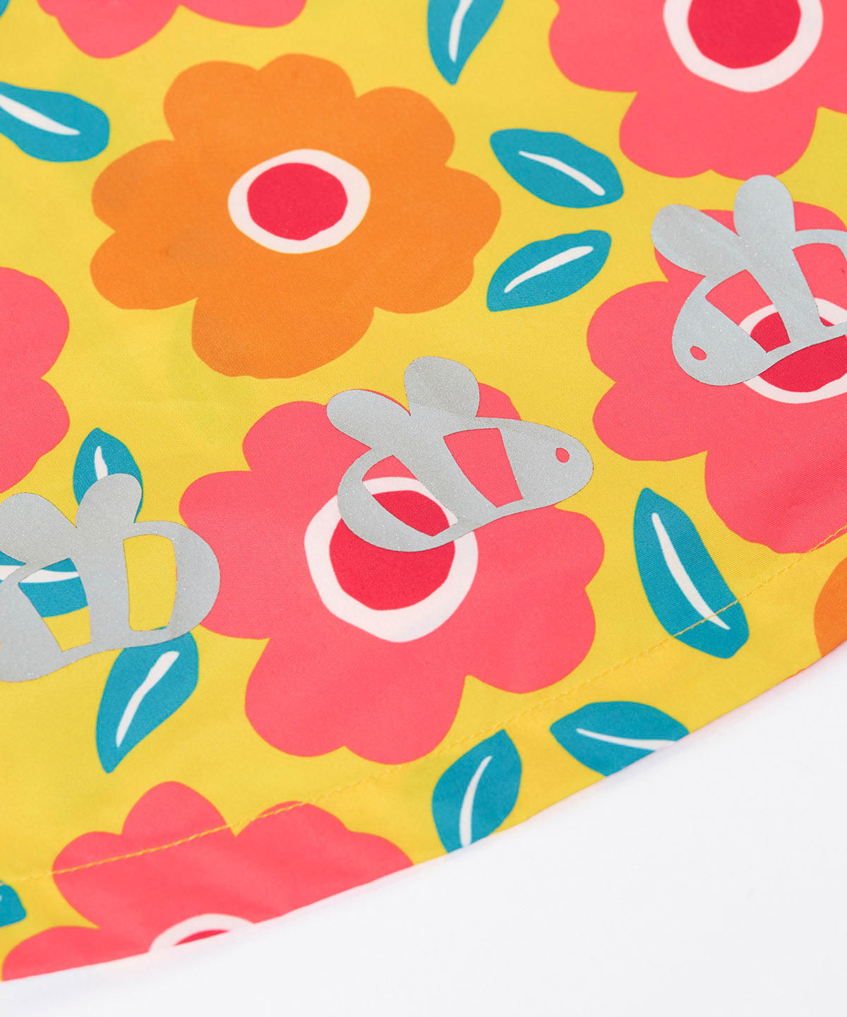 A close up of the yellow Frugi hooded rain jacket laid flat showing the repeating orange and pink floral print and reflective bee patches