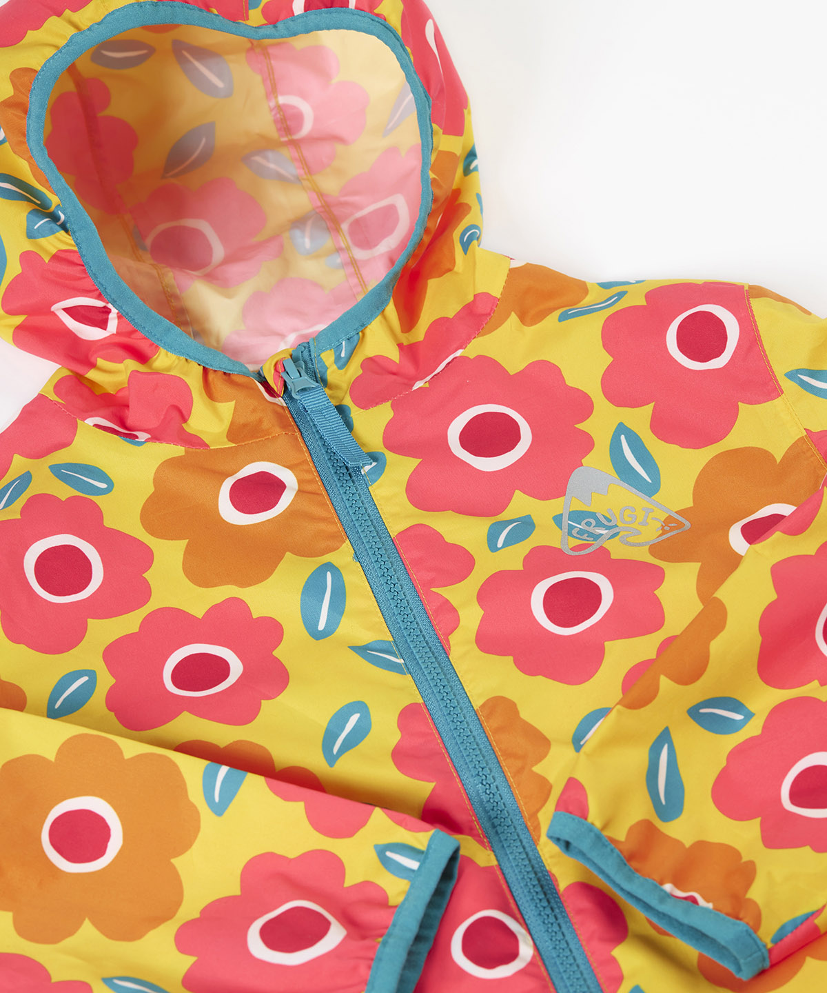 Frugi hooded rain jacket laid flat. In yellow and light blue trim with a repeating orange and pink floral print.