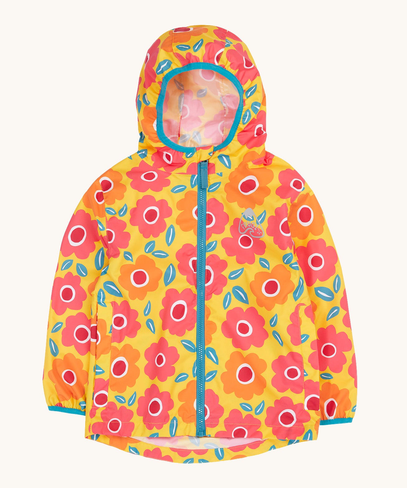 In the Floral Fields print, this jacket features blooming orange and pink flowers on a bright yellow background, finished with a turquoise zip. Shop Frugi rainwear at Babipur, your trusted UK destination for practical kids’ waterproof layers.