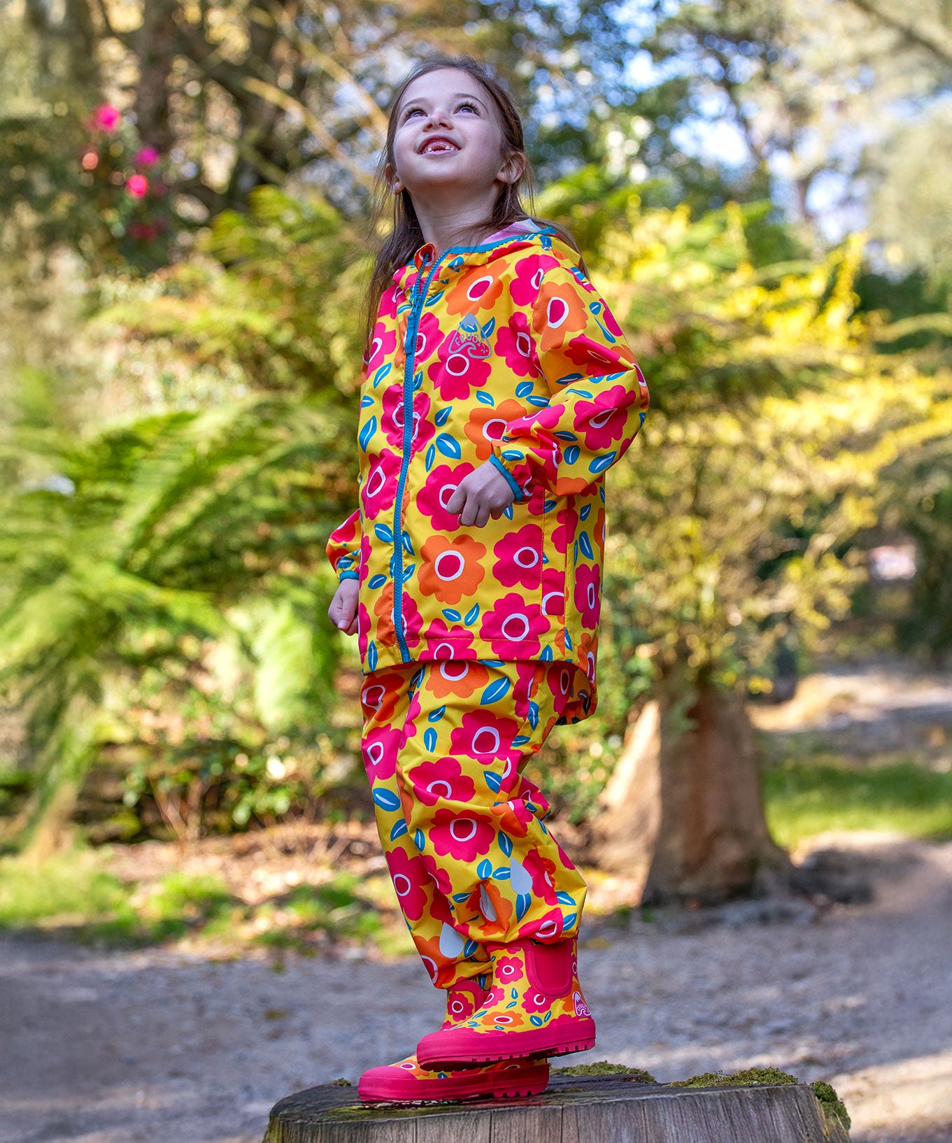 A child standing outdoors on a tree stump looking up at the sky wearing a Frugi flower fields rain jacket, waterproof trousers and matching wellington boots yellow rain or shine waterproof trousers an all over pink and orange flowers print.
