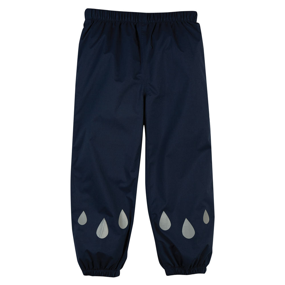 Keep children dry on wet days with these Frugi Indigo Rain Or Shine Trousers, waterproof to 3,000 HH. These Frugi waterproof trousers are eco-friendly wet weather gear, made with recycled plastic bottles. These dark blue waterproof pants have fully taped seams to keep out the rain, a stretchy elasticated waist gives room to grow and reflective markings will keep kids safe on dark afternoons.