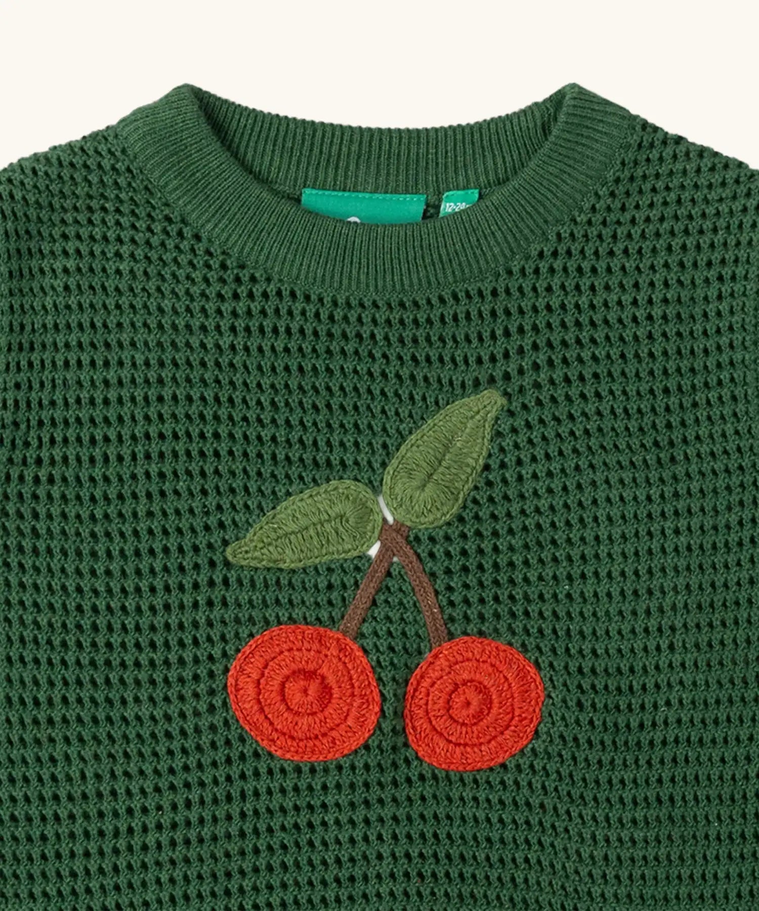 Close up of the cherry embroidered on the front of the Little Green Radicals kids dark green knitted sleeveless pullover.