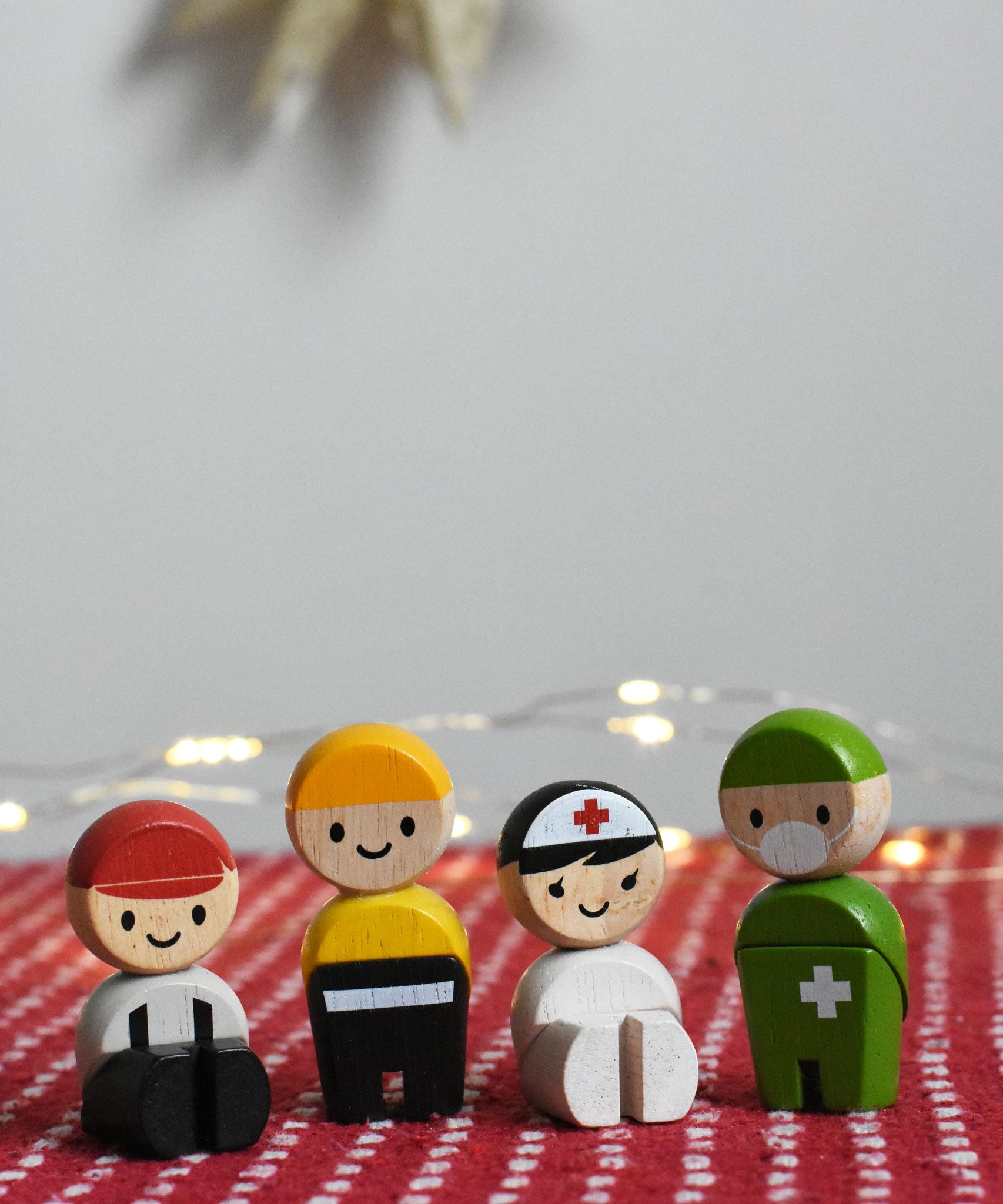 These emergency services people are hard at work every day. This set of four wooden dolls includes a surgeon, firefighter, nurse and mechanic. You can bend their legs to have them standing or sitting, and they're great for imaginative play. This set of four wooden figures is made from solid rubberwood and decorated with eco paints.