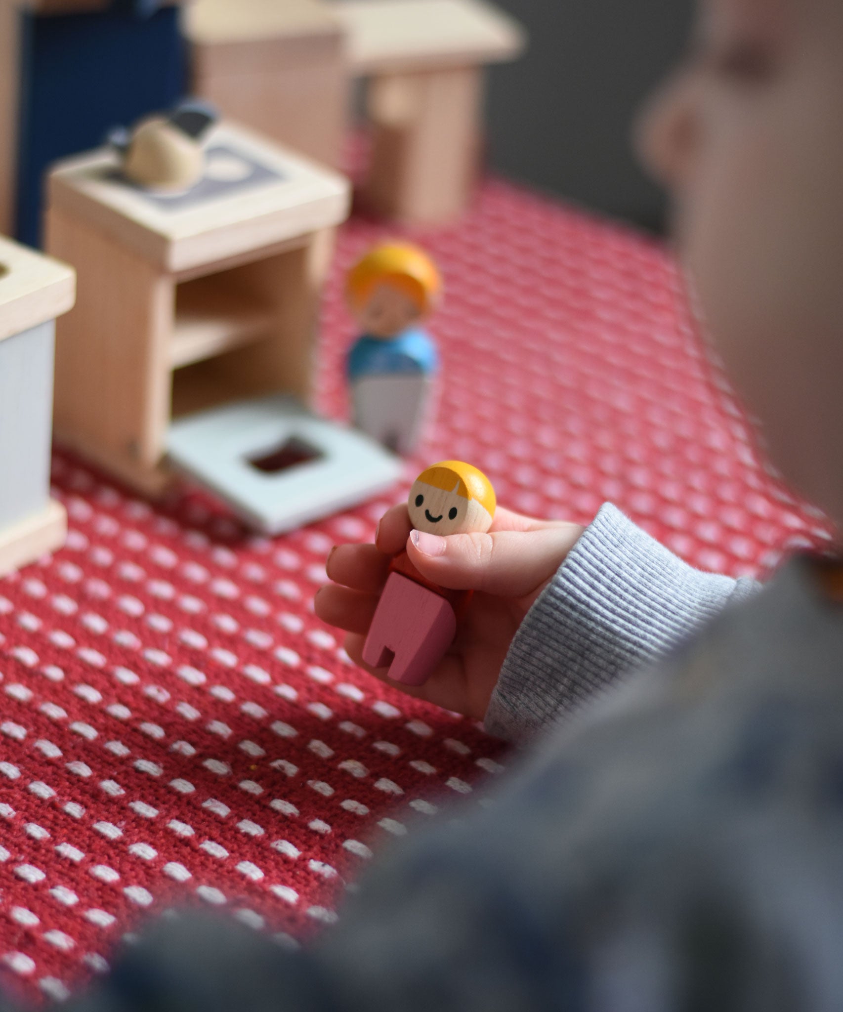 A child playing with the girl doll from the PlanToys PlanWorld wooden doll family with White Skin, Brown and Blonde Hair.