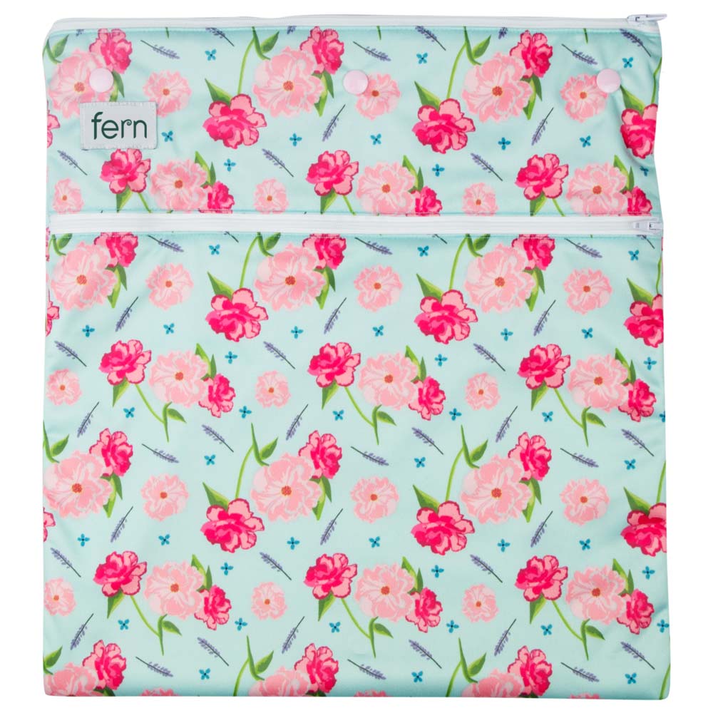 This Large Fern Wet bag super handy wet and dry bag with some handy features to make life a little easier. Zip closure with a PUL lined waterproof inner and a separate zip compartment on the front for dry things. What makes these Fern wet bags super fab though is an integrated mesh bag that's poppered inside so when you're ready to wash the contents you can simply un-popper the mesh bag and throw it in your machine or laundry bucket, magic! You can then use the bag without the lining or give it a wash.