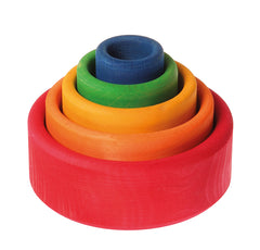 A set of six traditional wooden spinning tops from Grimm's, in rainbow colours and arranged in a circle.