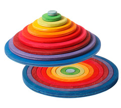 The Grimm's wooden concentric pastel rainbow rings and circles laid out on the floor, along with the rainbow and pastel wooden spinning tops.